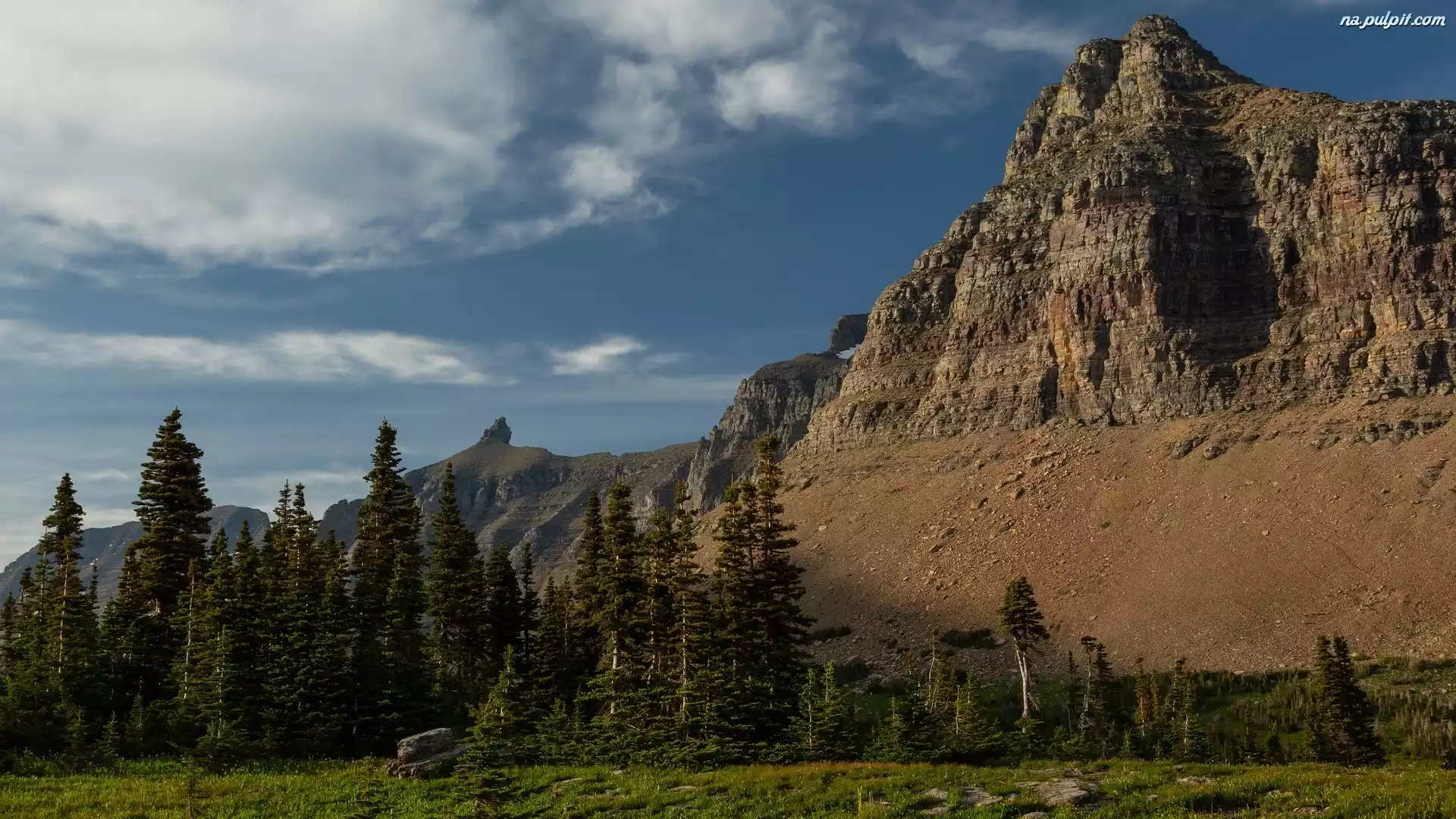 Trawa, Drzewa, Park Narodowy Glacier, Góry, Stany Zjednoczone, Montana, Skały, Świerki Na Pulpit