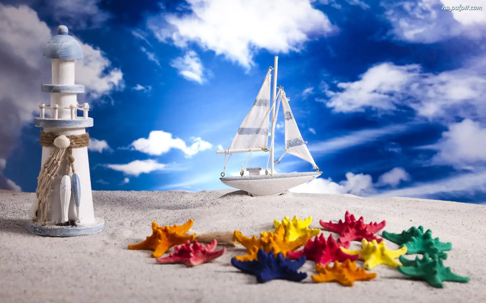 Stateczek, Morska, Rozgwiazdy, Plaża, Niebo, Latarnia