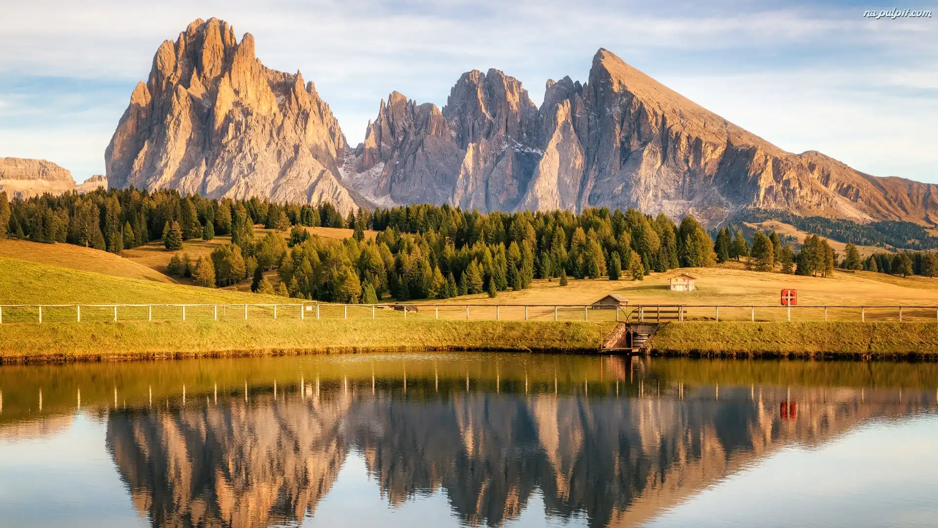 Domy, Dolomity, Góra Schlern, Tyrol, Włochy, Drzewa, Góry, Staw Na Pulpit