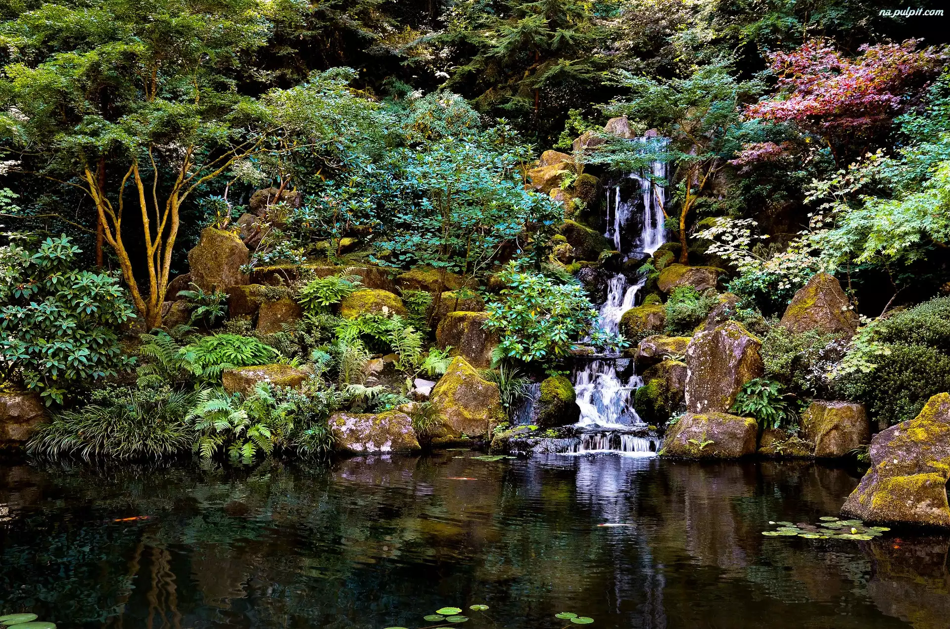 Staw, Wodospad, Ogród, Japoński, Drzewa Na Pulpit