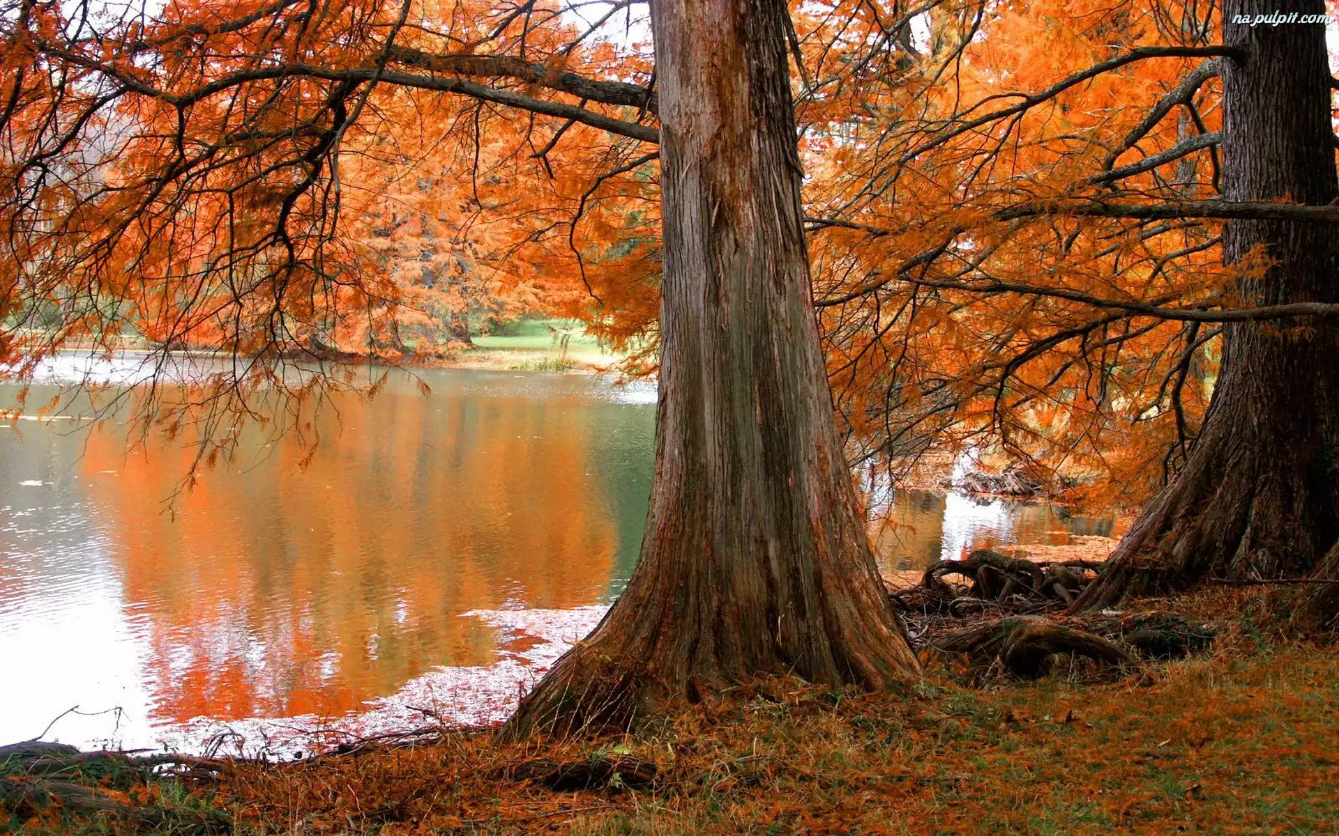 Staw, Żółte, Drzewa, Jesień, Liście