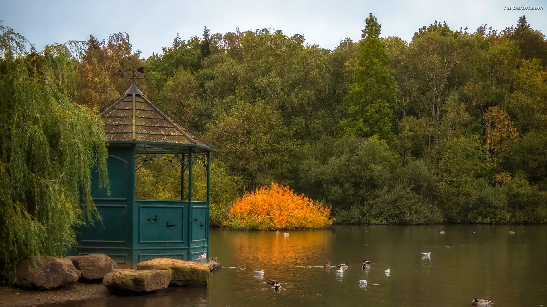 Staw, Kamienie, Kaczki, Drzewa, Park, Altana