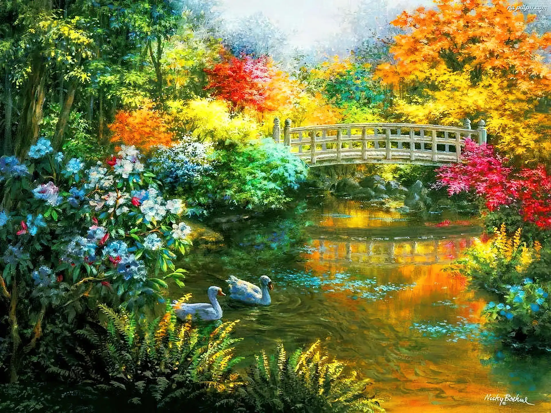 Staw, Widoczek, Malarstwo, Mostek, Park, Kaczki Na Pulpit
