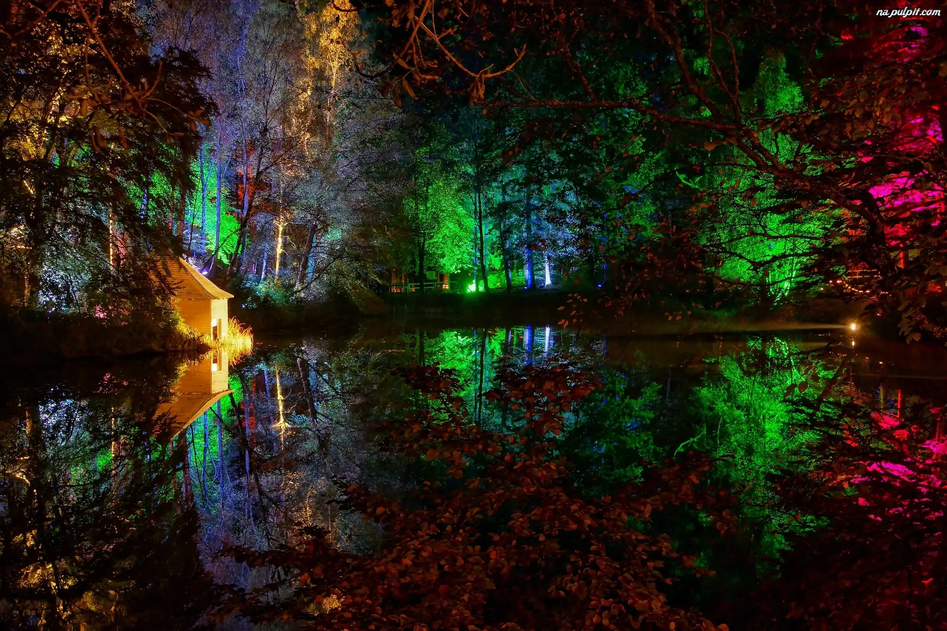 Staw, Światła, Noc, Altanka, Park, Kolorowe