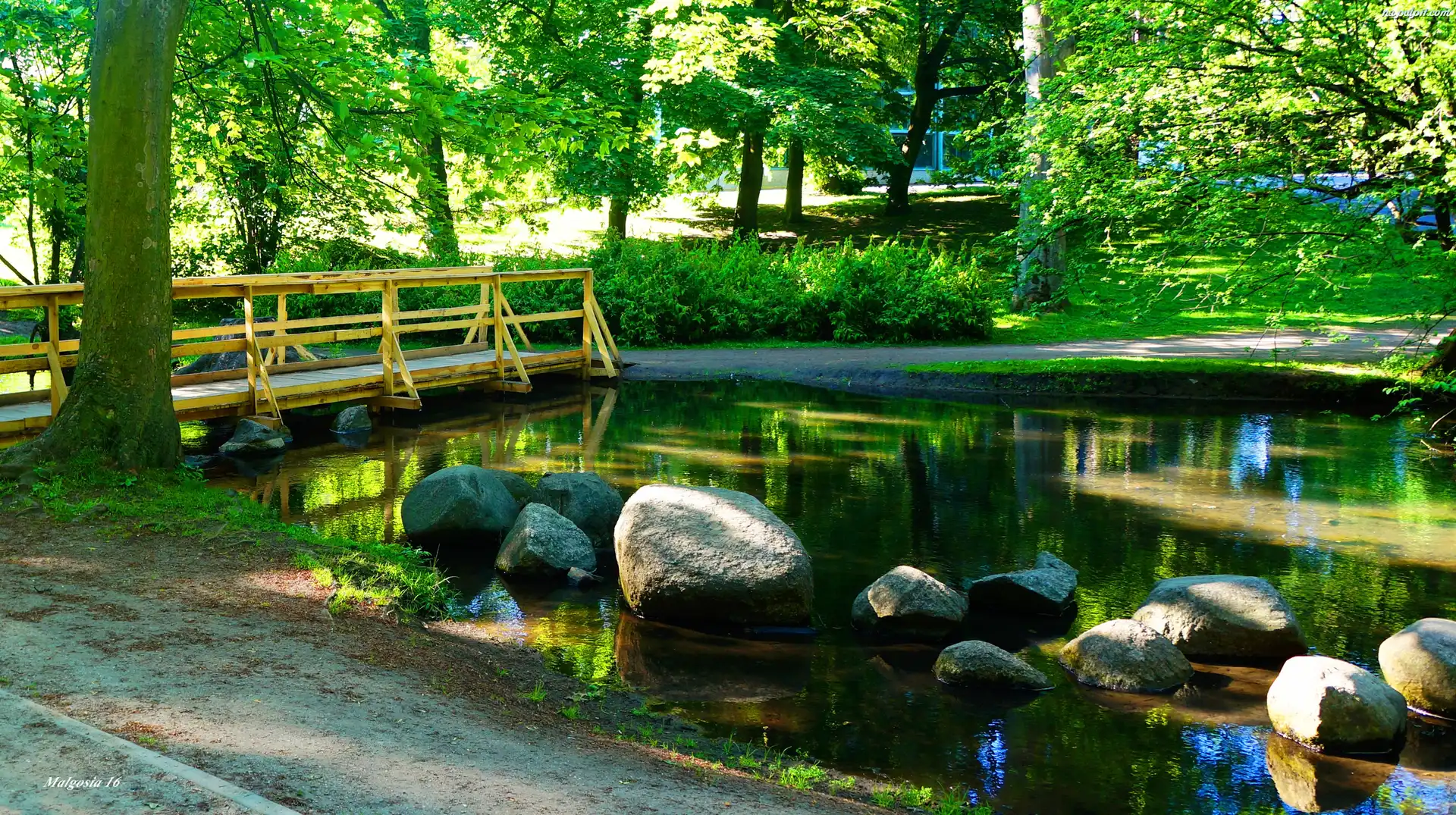 Zieleń, Staw, Drzewa, Mostek, Woda, Park, Kamienie Na Pulpit