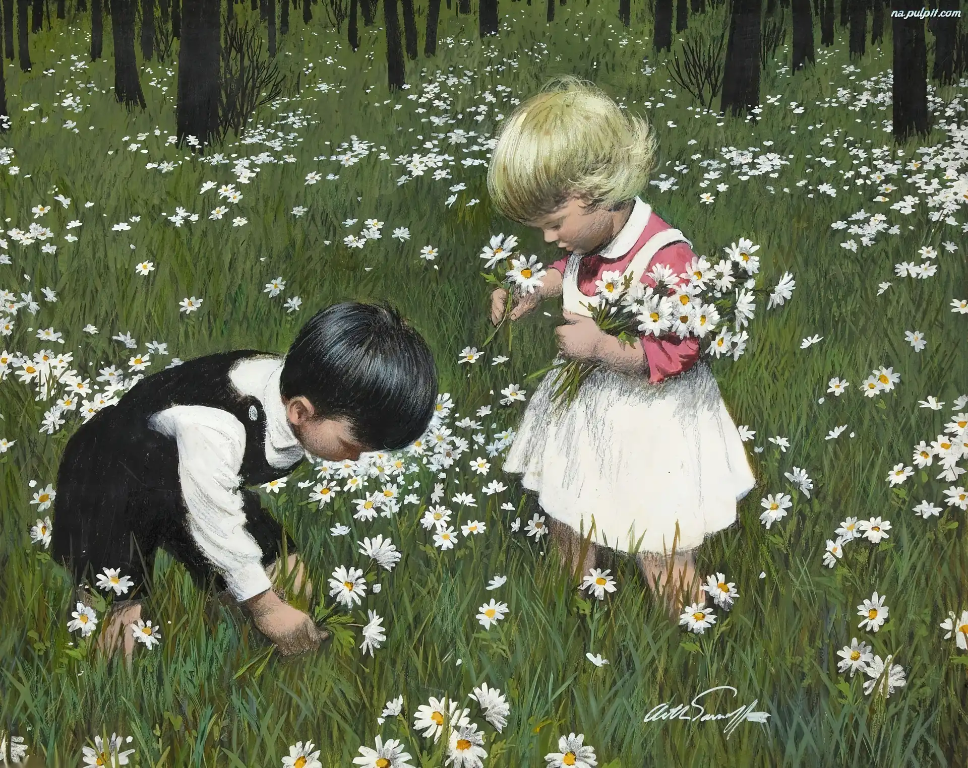 Stokrotki, Dziewczynka, Chłopiec, Łąka