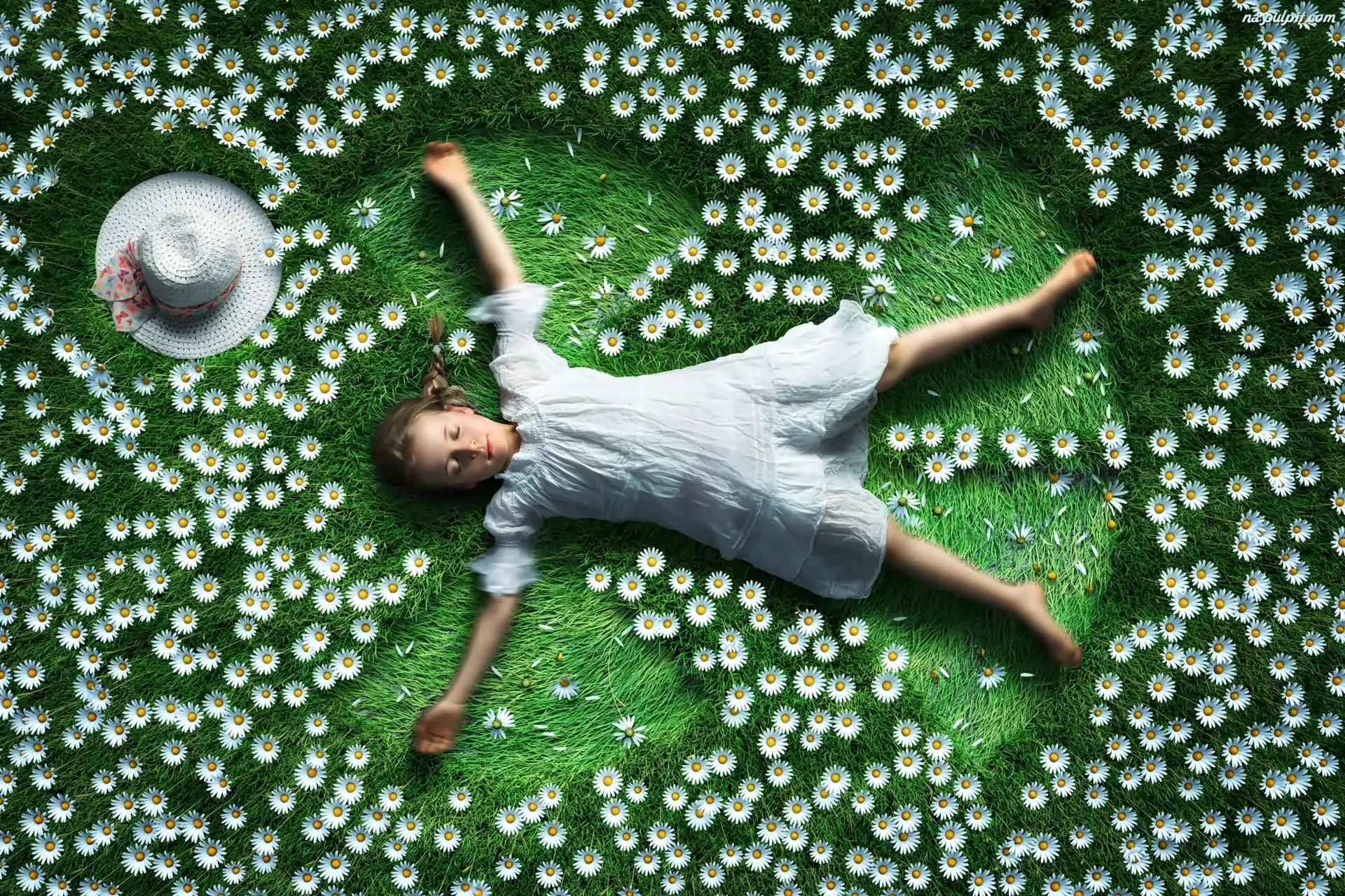 Stokrotki, Kapelusz, Dziewczynka, Łąka