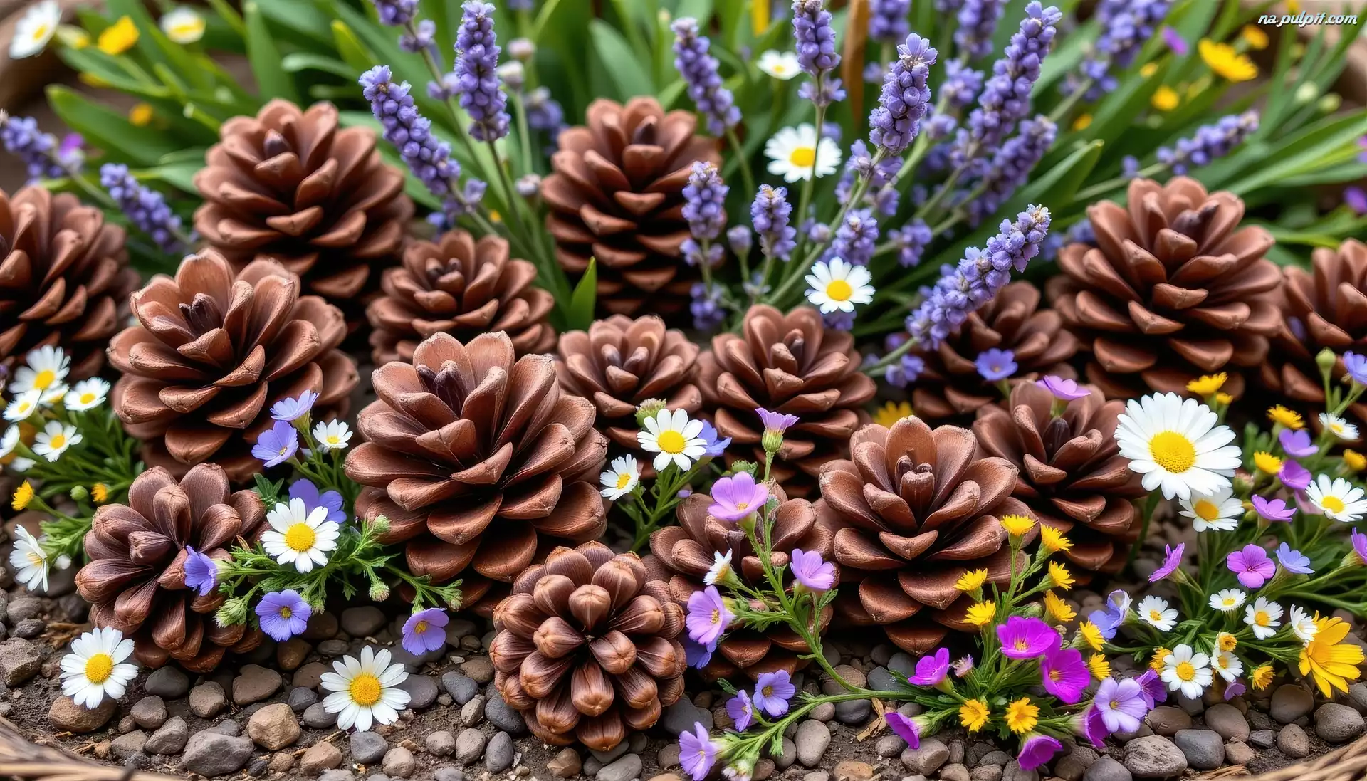 Szyszki, Kwiaty, Lawenda, Stokrotki