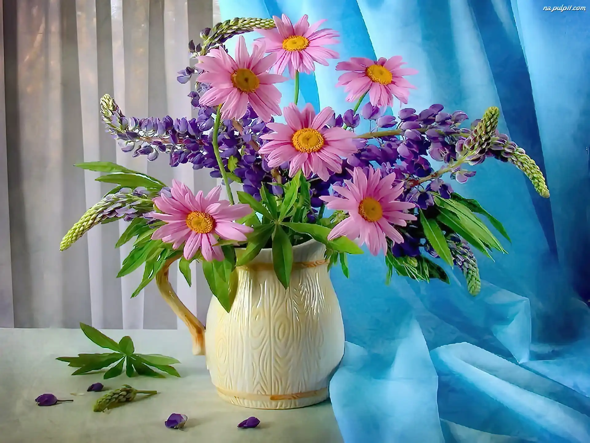 Stokrotki, Łubin, Wazon, Różowe Na Pulpit