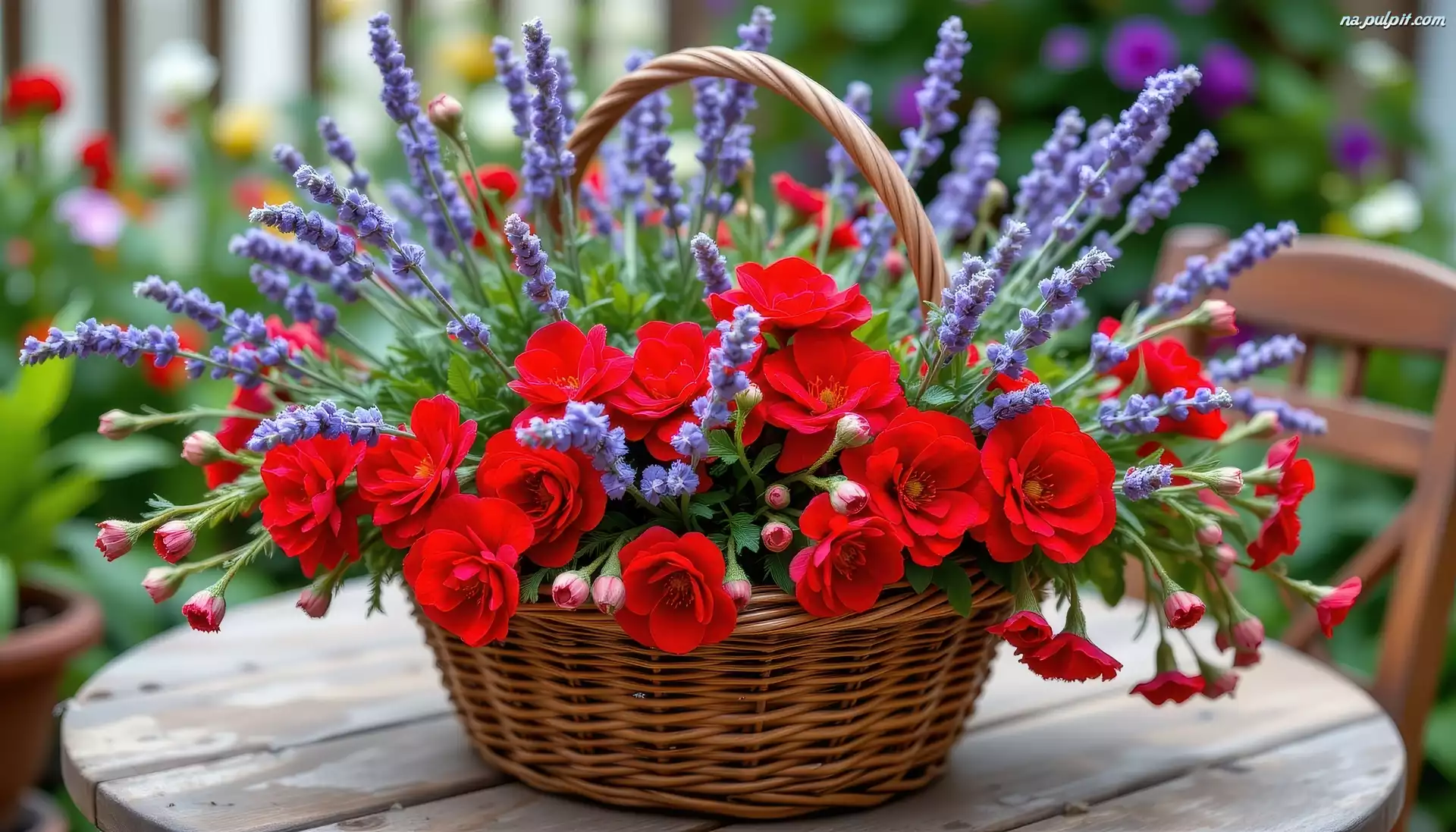 Ogród, Kwiaty, Koszyk, Stolik, Lawenda, Grafika AI Na Pulpit