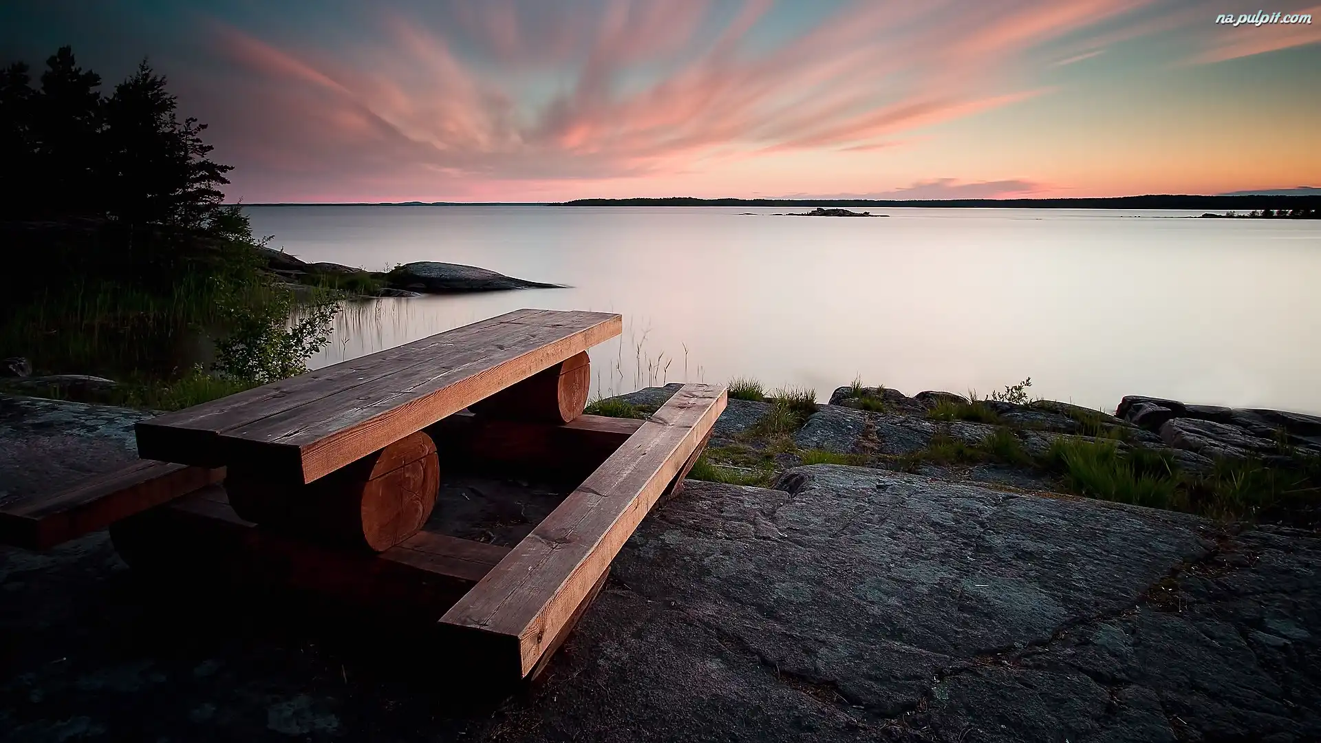 Ławka, Drzewa, Skały, Poranek, Wschód słońca, Jezioro, Stolik Na Pulpit