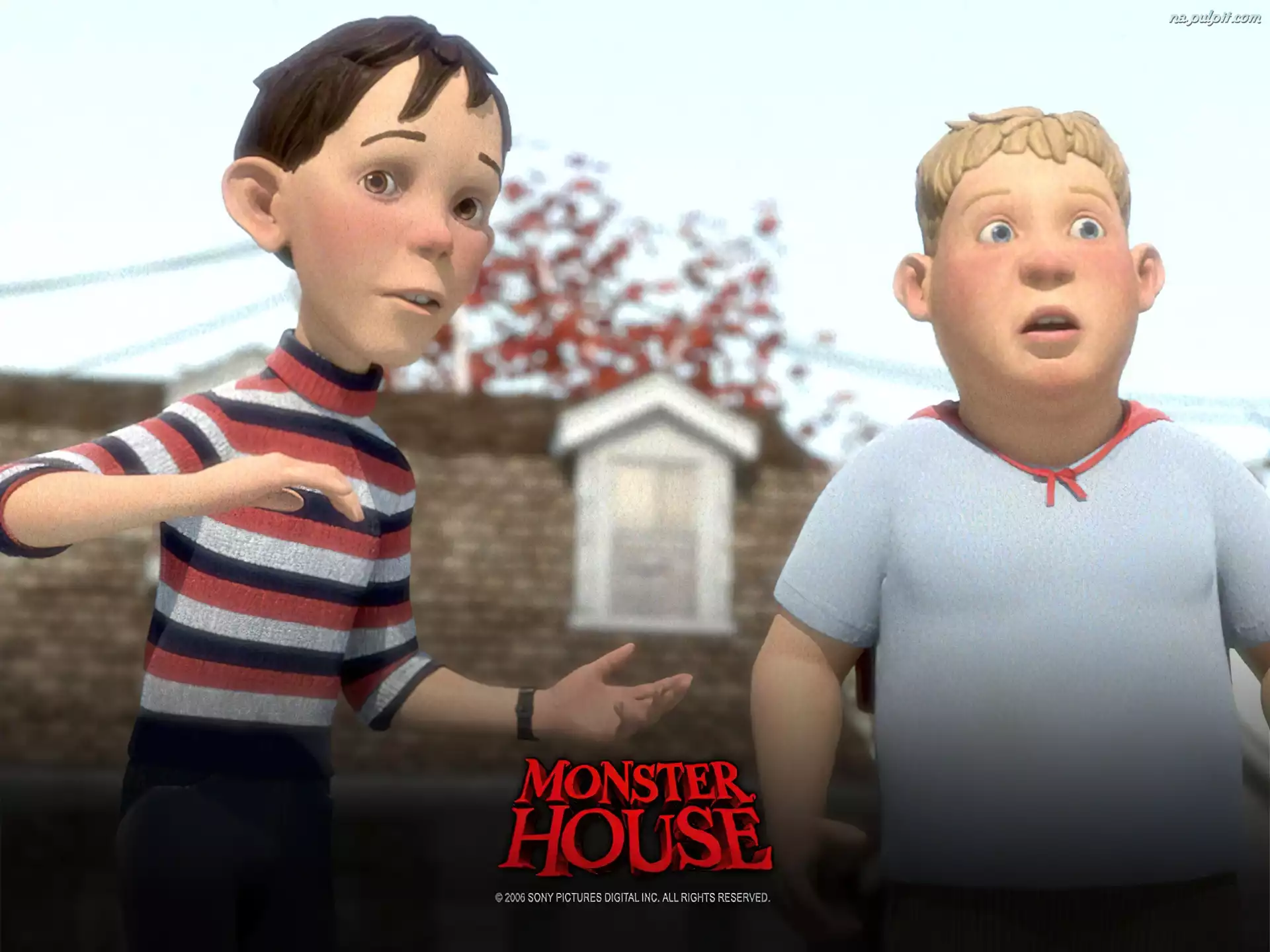 Straszny dom, Monster House, dzieci, horror mężczyzna, Monster house, Straszny dom, dzieci chłopcy, Straszny Dom Monster House, dziewczynka, ruda, Straszny dom chłopiec, Monster house, Straszny dom, okno Straszny Dom, drzewa