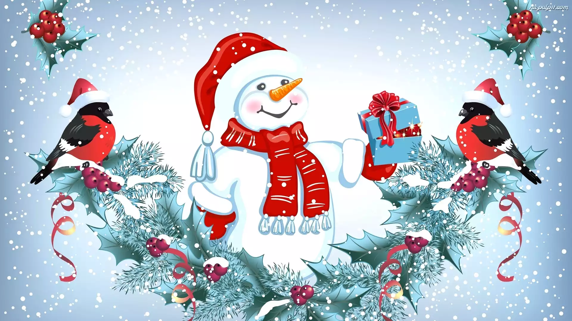 Prezent, Grafika 2D, Stroik, Bałwan, Świąteczna, Ptaszki