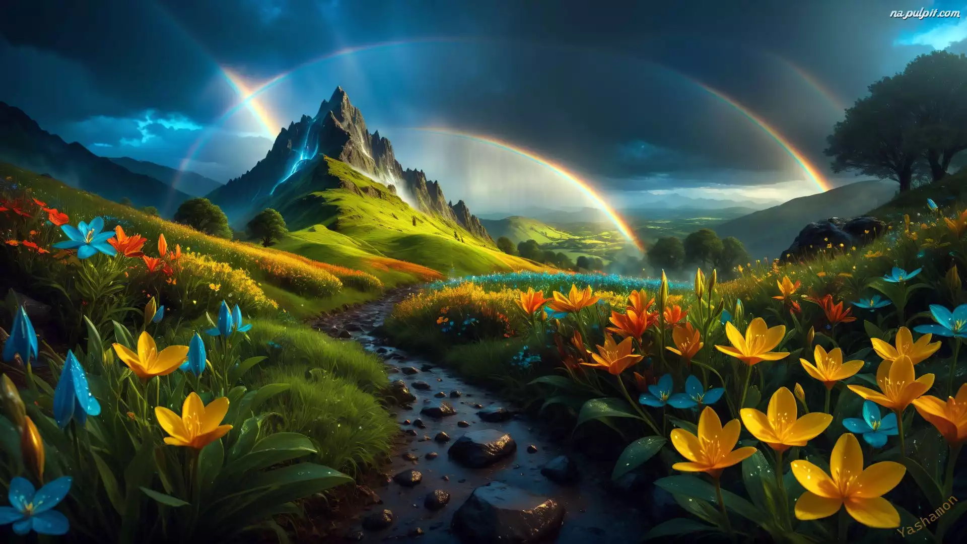 Kwiaty, Tęcza, Kamienie, Góry, Grafika, Drzewa, Skały, Strumień Na Pulpit