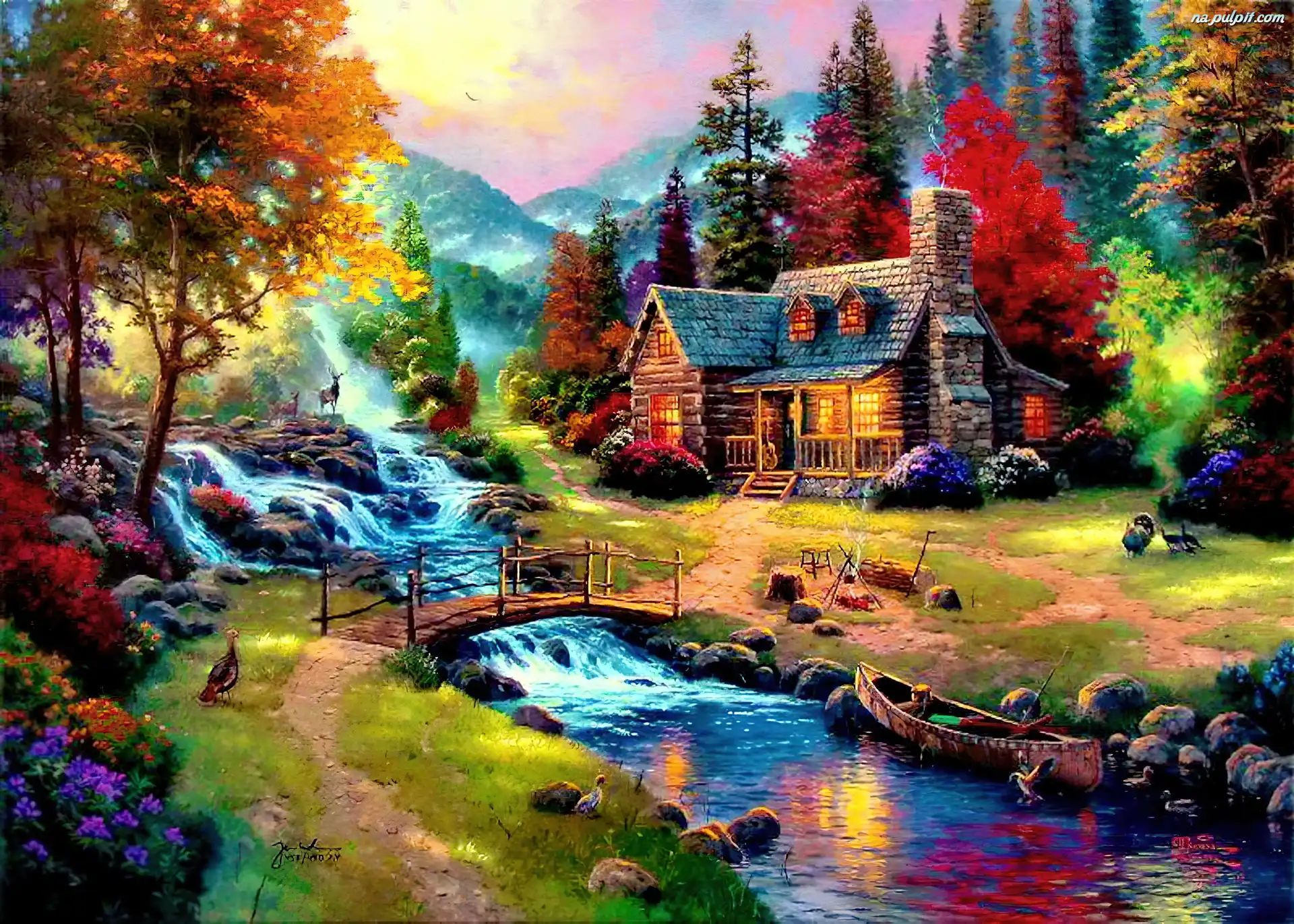Strumyk, Widoczek, Malarstwo, Drzewa, Dom, Góry Na Pulpit