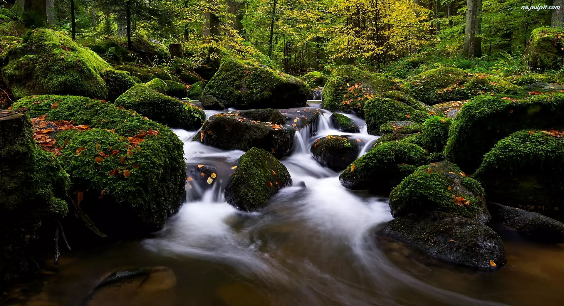 Las, Strumyk, Drzewa, Kamienie, Omszałe, Rzeka, Liście Na Pulpit