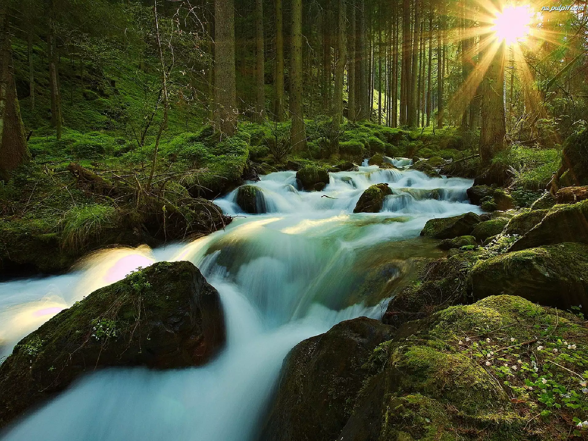 Strumyk, Słońca, Promienie, Las, Kamienie Na Pulpit