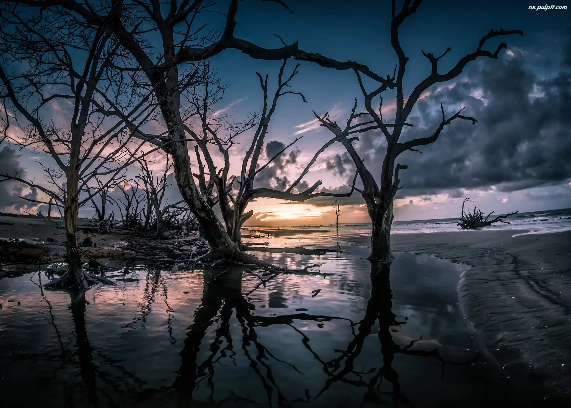 Suche, Karolina Południowa, Wyspa Edisto, Drzewa, Plaża, Rezerwat przyrody Botany Bay Plantation Wildlife Management Area, Stany Zjednoczone, Wschód Słońca Na Pulpit |