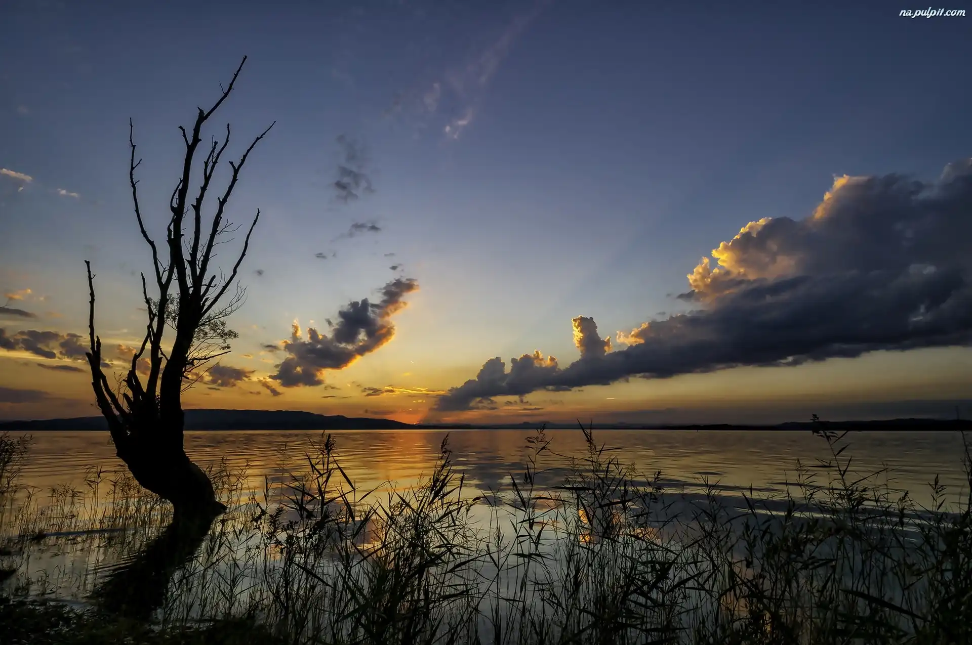 Słońca, Suche, Zachód, Trawy, Drzewo, Jezioro, Chmury Na Pulpit