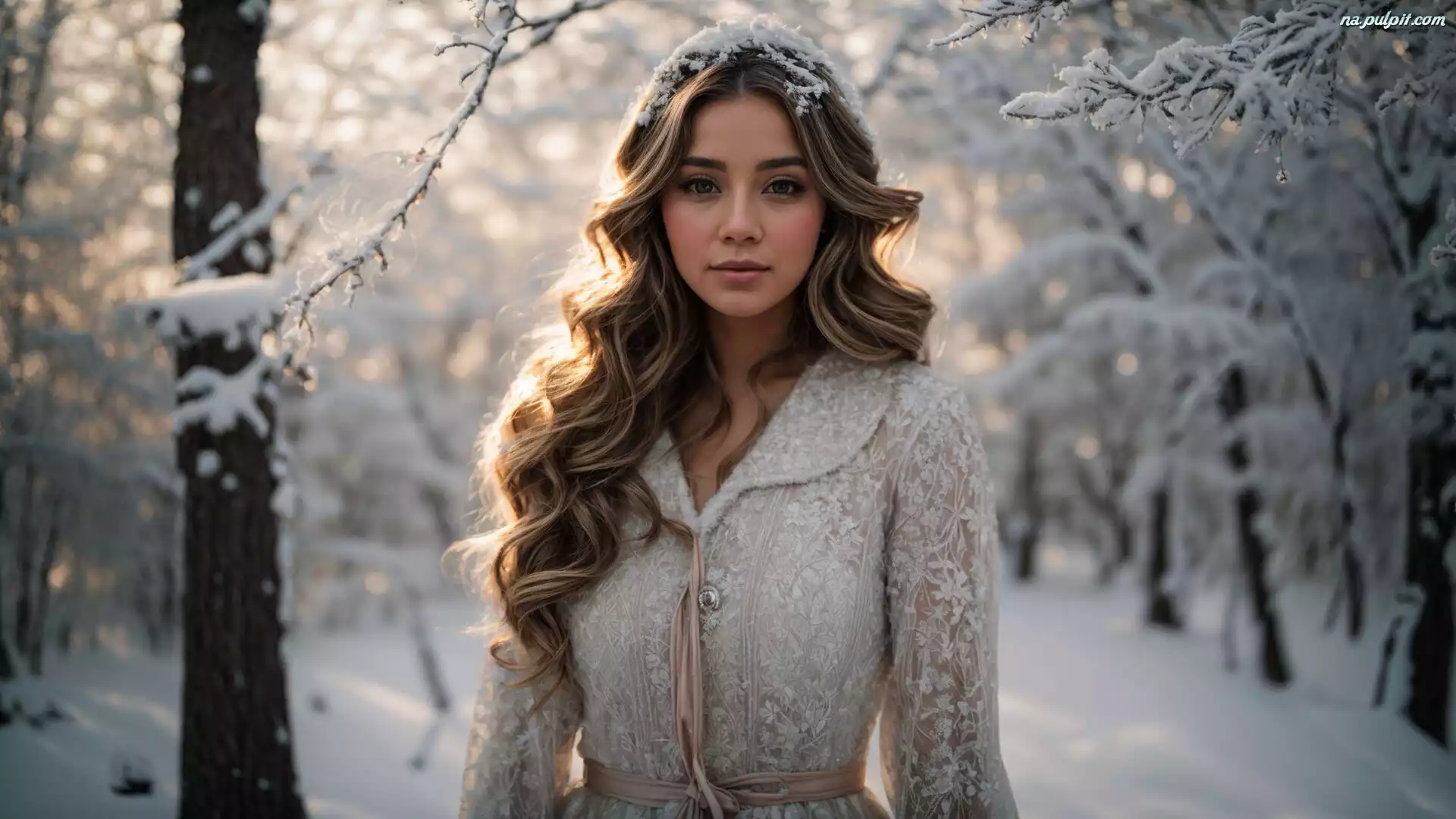 Las, Zima, Długowłosa, Sukienka, Kobieta, Śnieg Na Pulpit