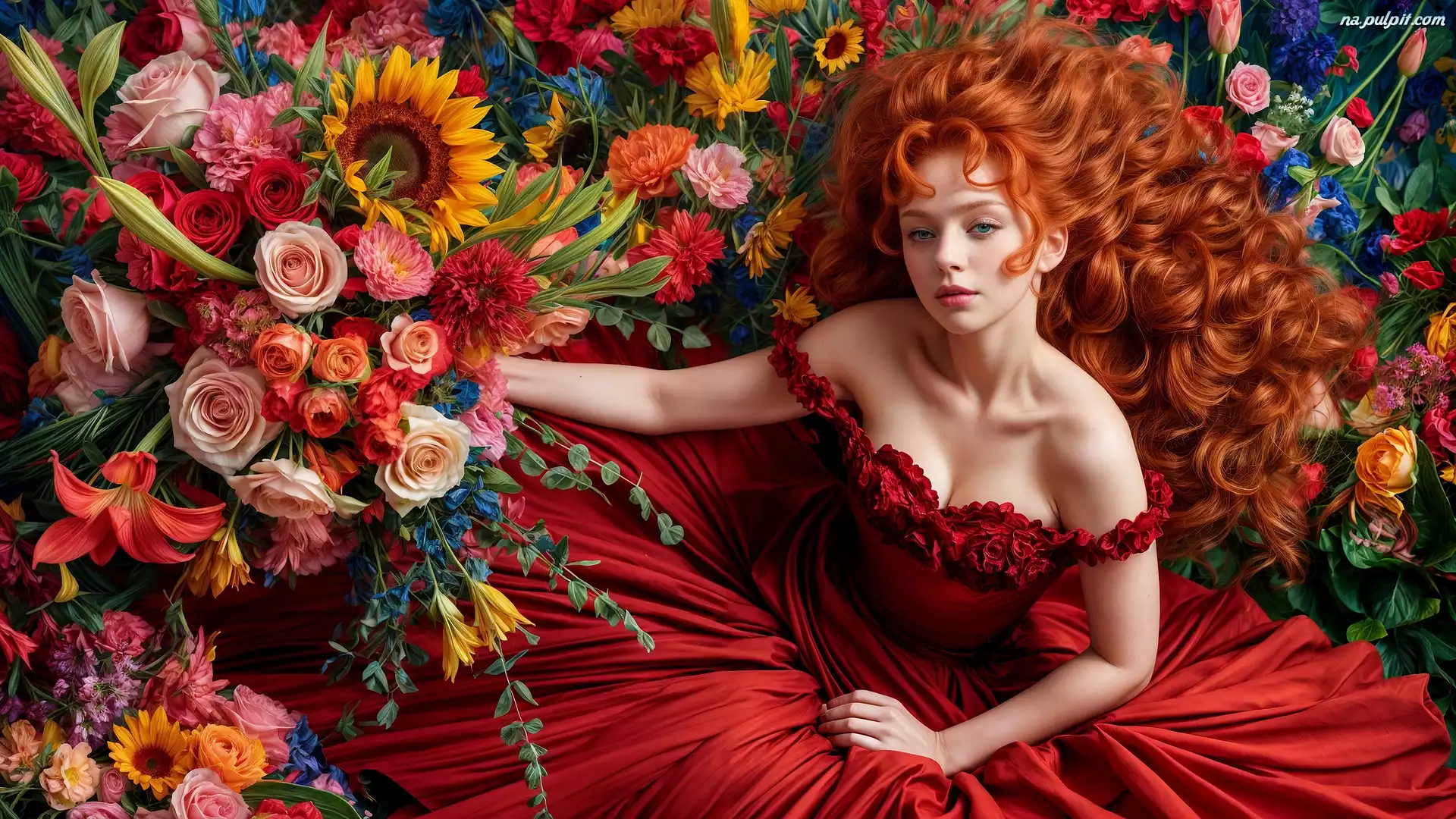Kwiaty, Rudowłosa, Czerwona, Suknia, Kobieta, Grafika Na Pulpit