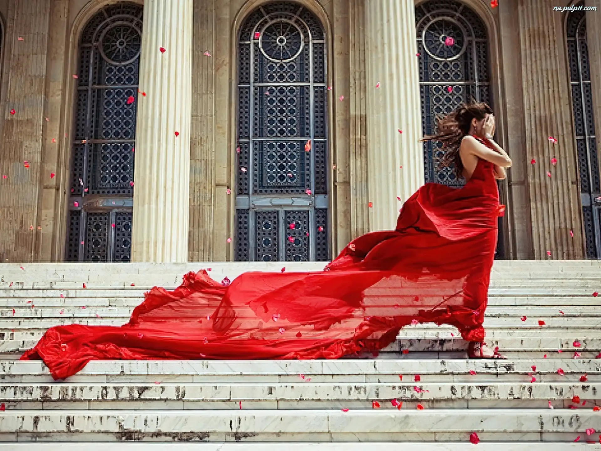 Suknia, Schodach, Na, Kobieta, Czerwona