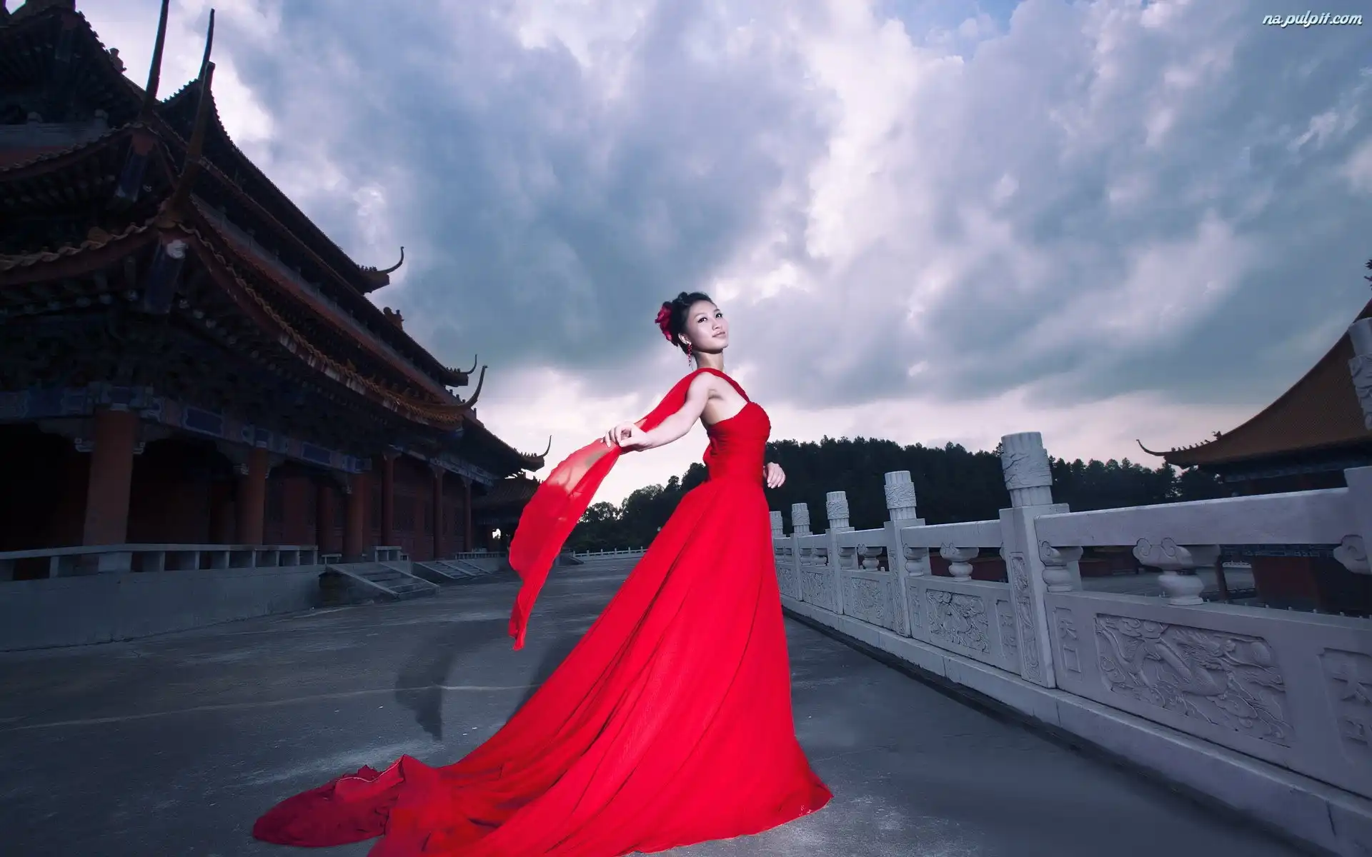 Suknia, Kobieta, Elegancka, Pagody, Czerwona