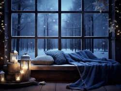 Gwiazdki, Świąteczne, Las, Poduszki, Drzewa, Świeczki, Światełka, Okno, Śnieg, Pled, Zima Na Pulpit |