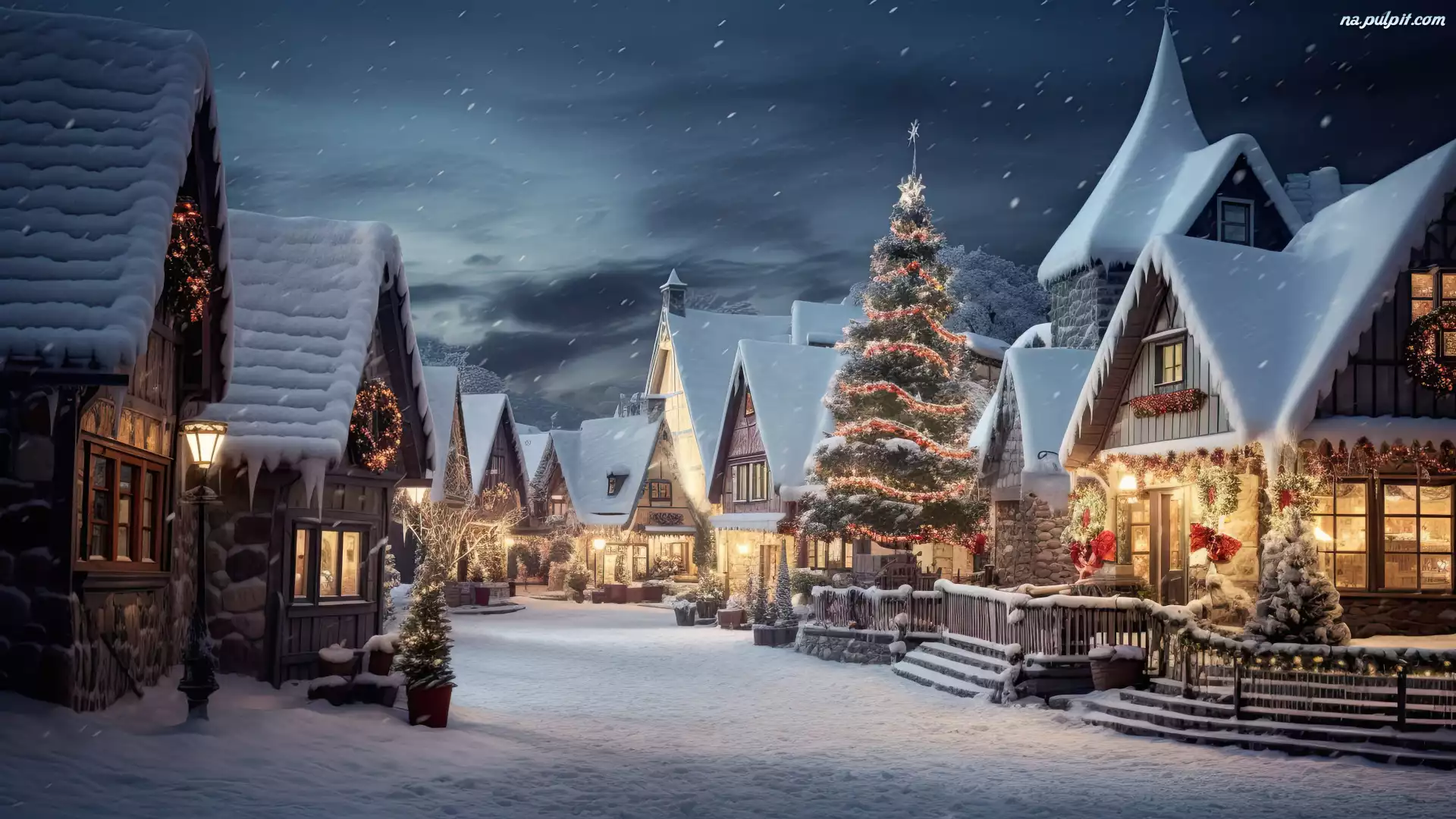 Światła, Wieś, Ulica, Boże Narodzenie, Wieczór, Choinka, Zima, Domy Na Pulpit