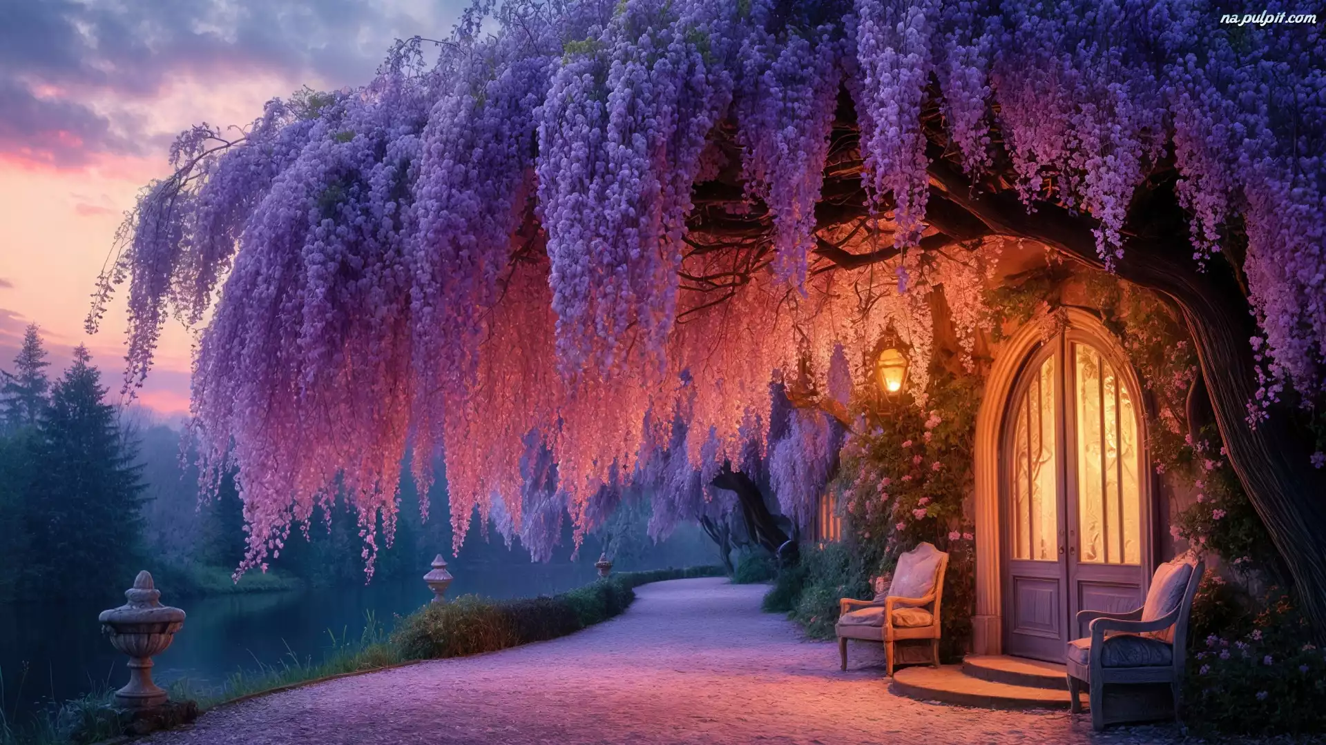 Grafika AI, Dom, Jezioro, Drzewo, Kwiaty, Glicynia, Światła Na Pulpit