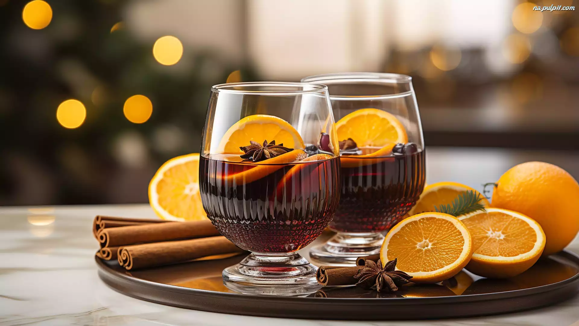 Światła, Grafika, Wino, Anyż, Cynamon, Kieliszki, Grzane, Taca, Pomarańcze