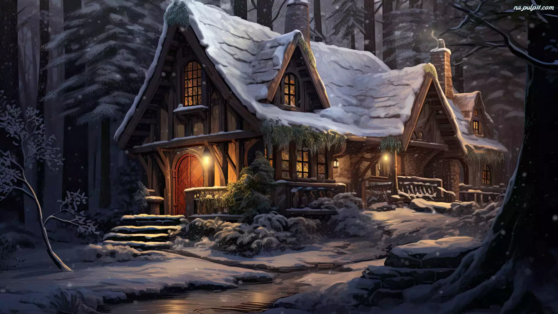 Światła, Grafika, Las, Noc, Drzewa, Śnieg, Zima, Dom, Rzeka Na Pulpit