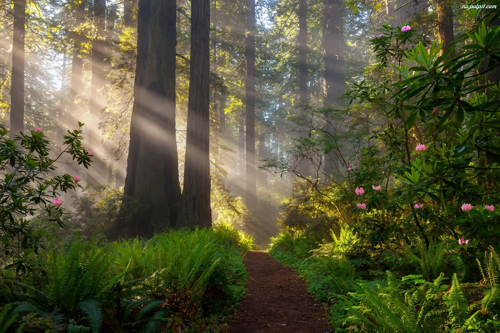 Przebijające światło, Las, Droga, Paprocie, Różaneczniki, Lato, Drzewa Na Pulpit