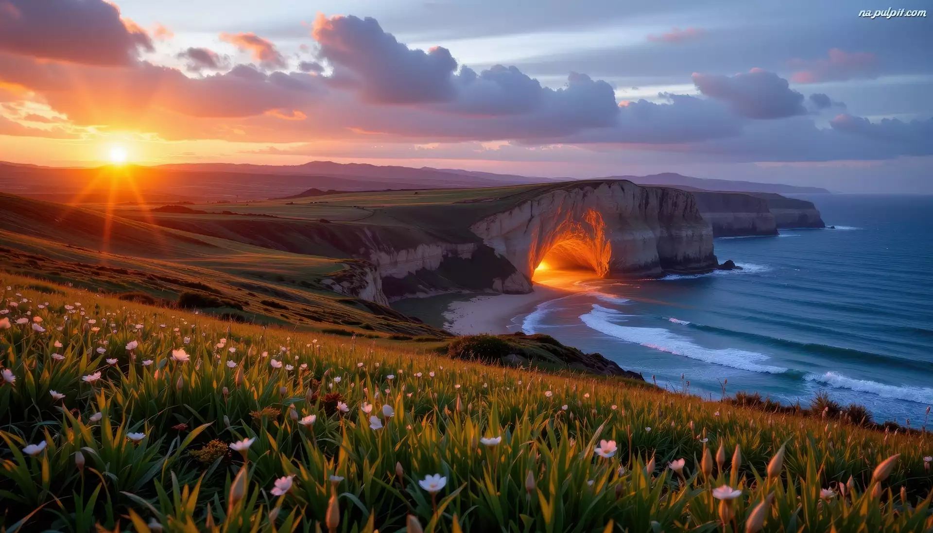 Światło, Klif, Morze, Łąka, Grafika AI, Zachód słońca, Zbocze, Jaskinia Na Pulpit