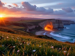 Światło, Klif, Morze, Łąka, Grafika AI, Zachód słońca, Zbocze, Jaskinia