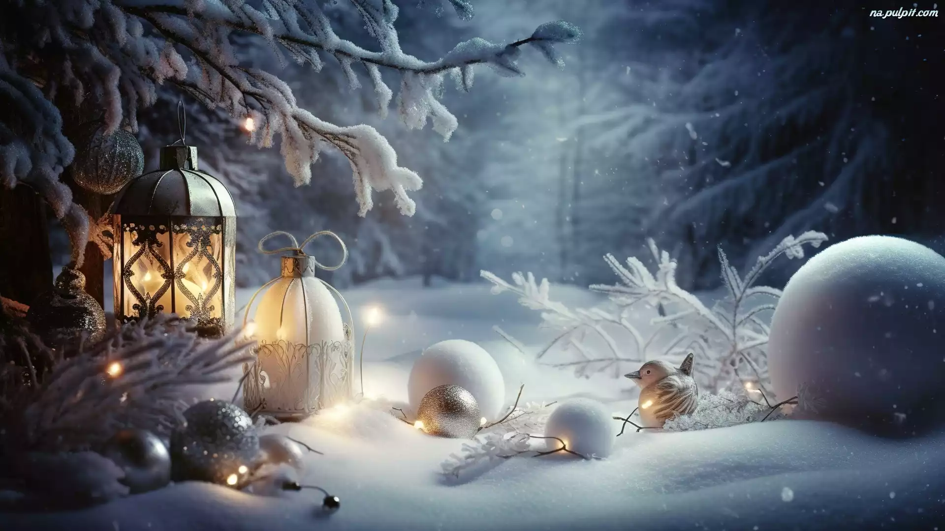 Boże Narodzenie, Lampiony, Bombki, Zima, Las, Śnieg, Świeca Na Pulpit