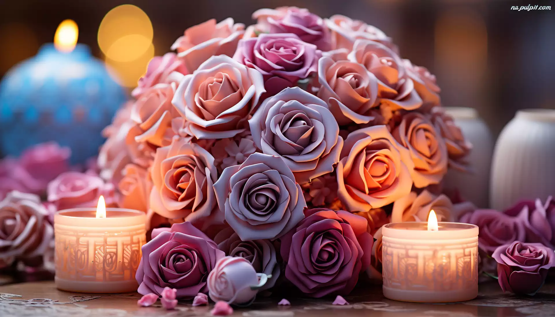 Kompozycja, Kwiaty, Róże, Świeczki