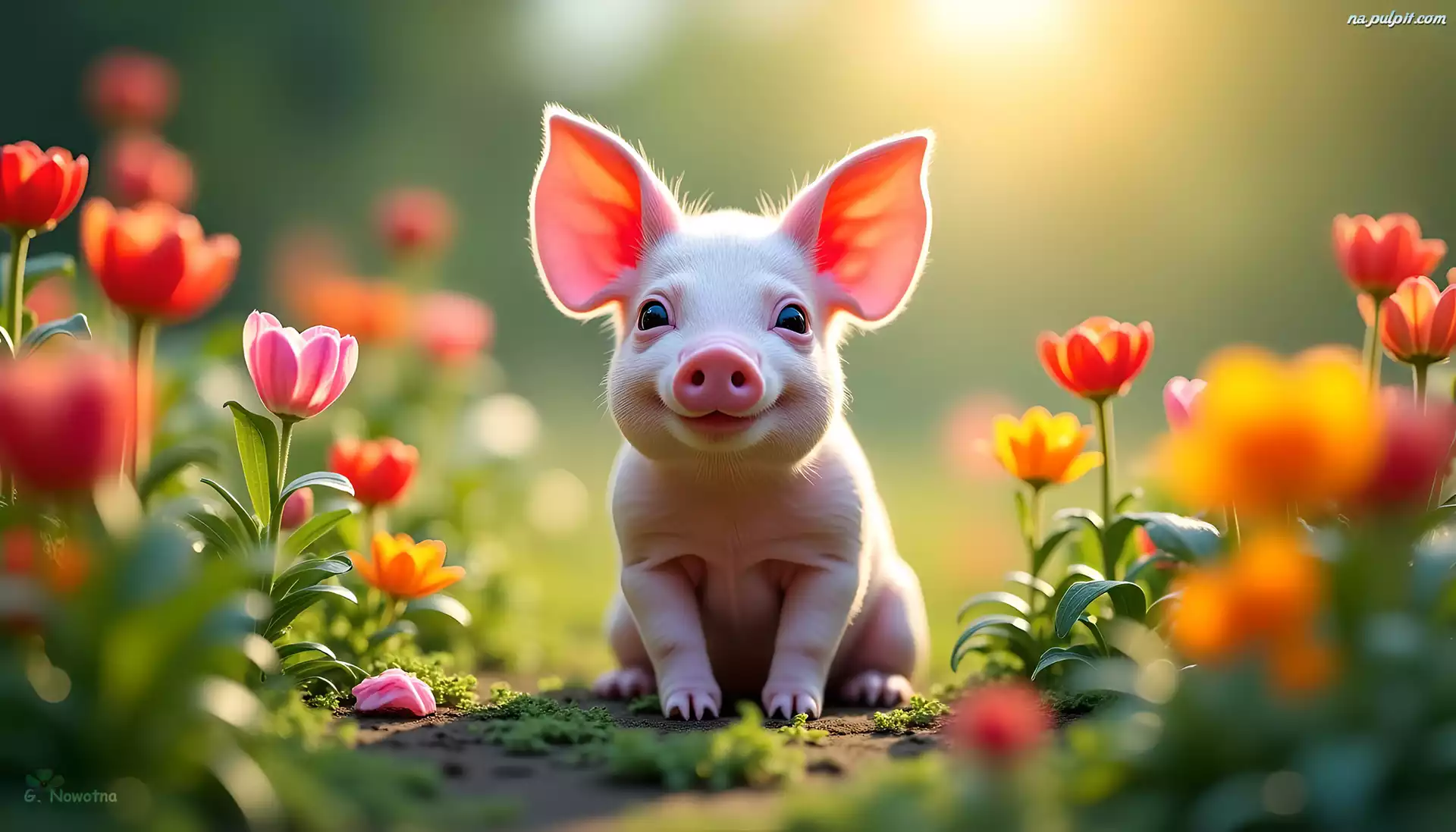 Prosiaczek, Świnka, Kwiaty, Grafika AI Na Pulpit