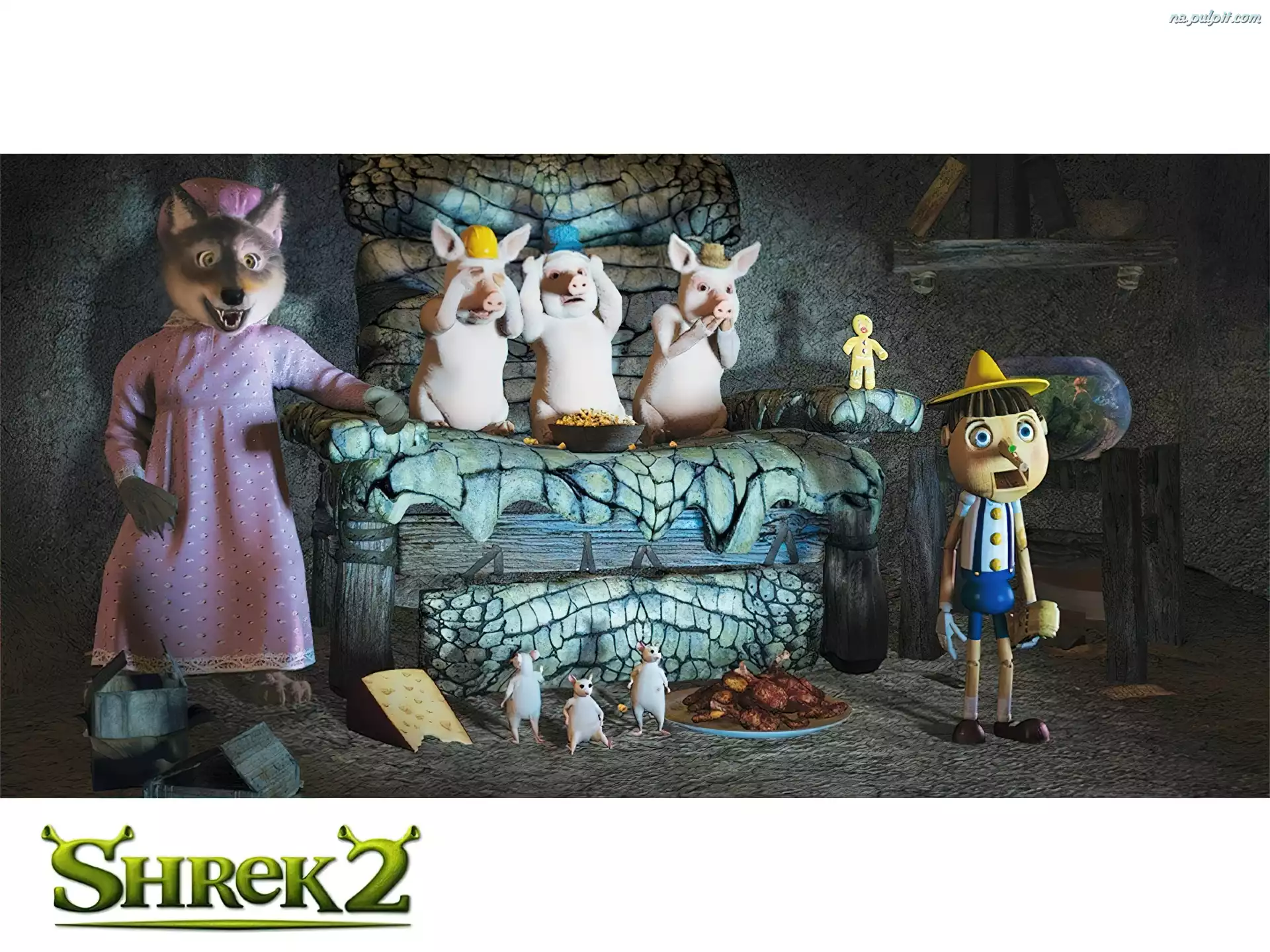 świnki, wilk, Shrek 2, Pinokio Na Pulpit