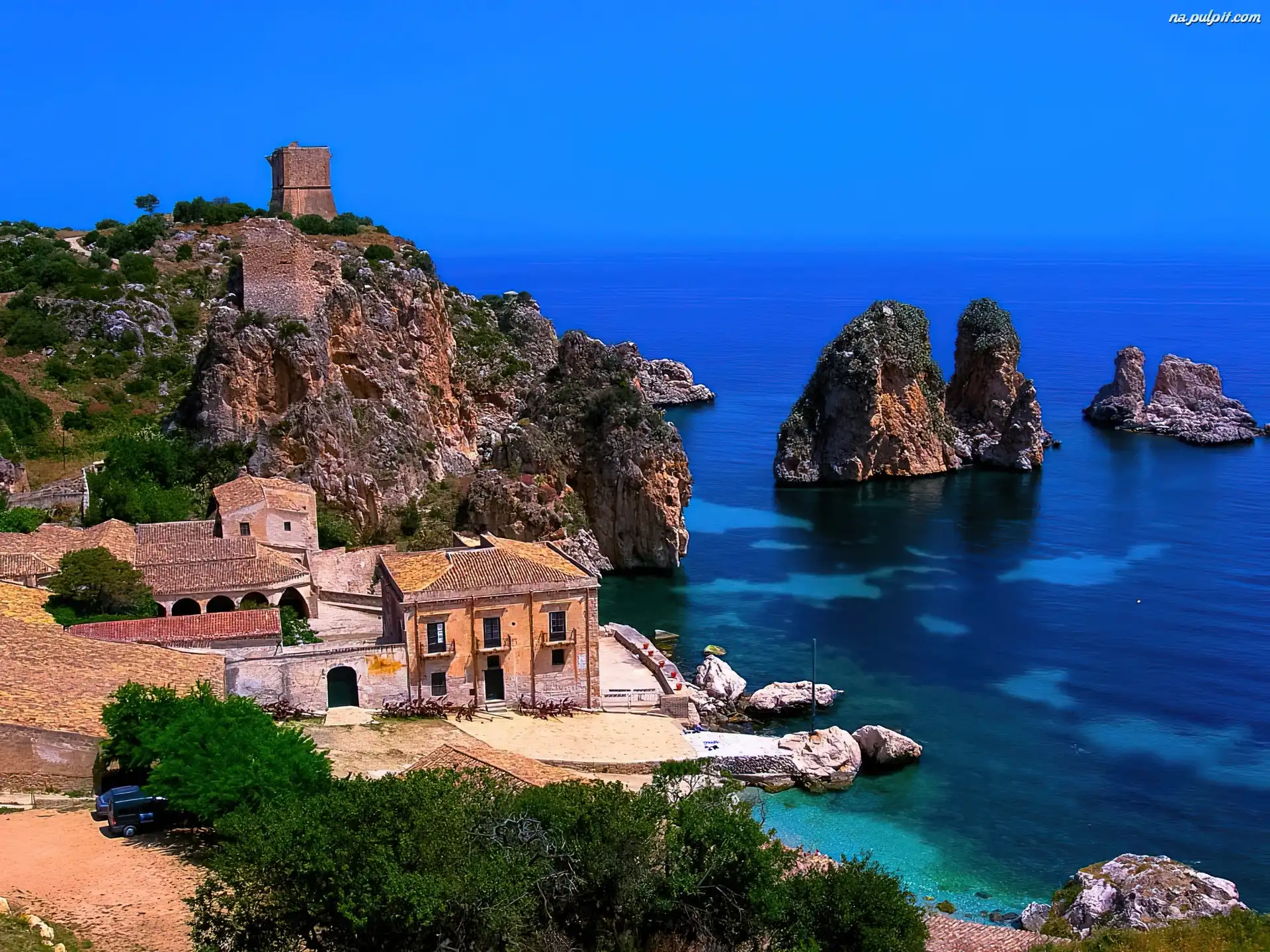 Sycylia, Skały, Morze, Domy Na Pulpit