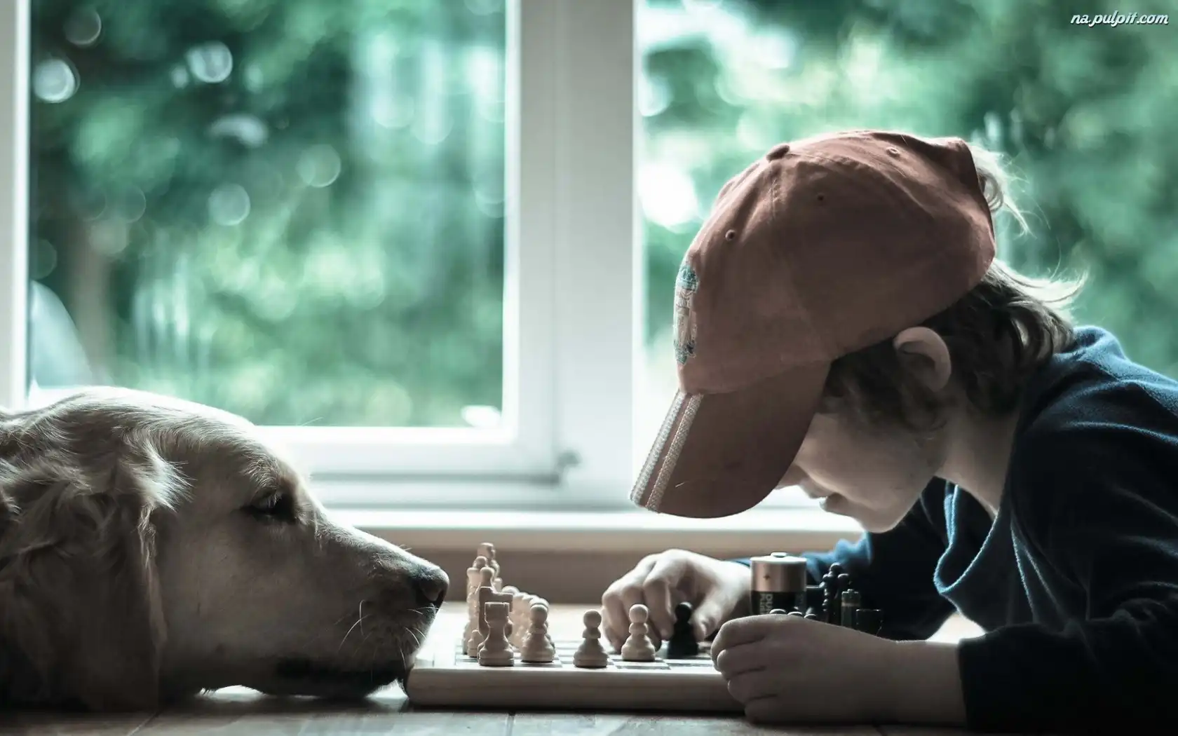 Szachy, Golden Retriever, Chłopiec Na Pulpit