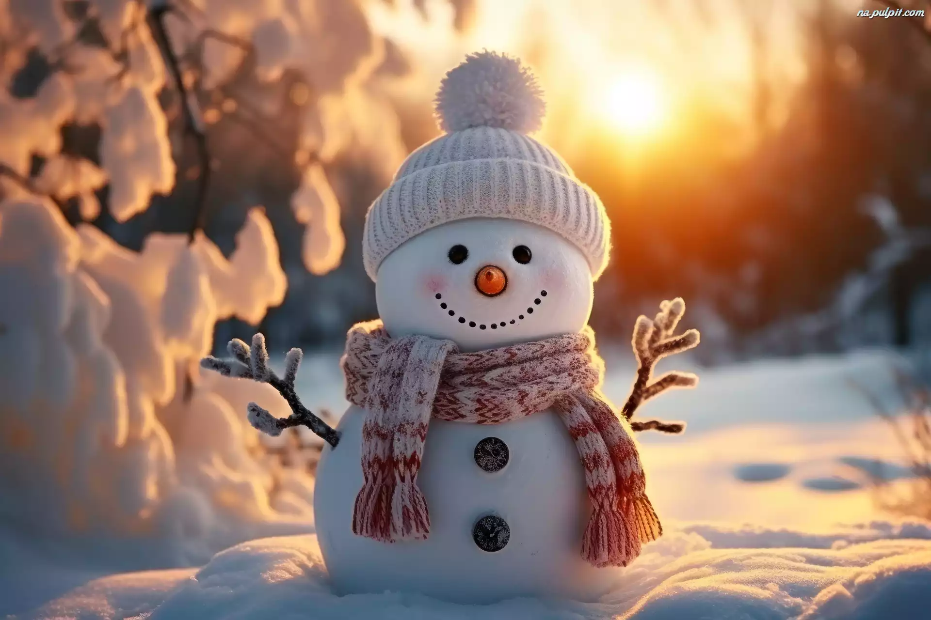 Zachód słońca, Bałwanek, Szalik, Grafika AI, Czapka Na Pulpit
