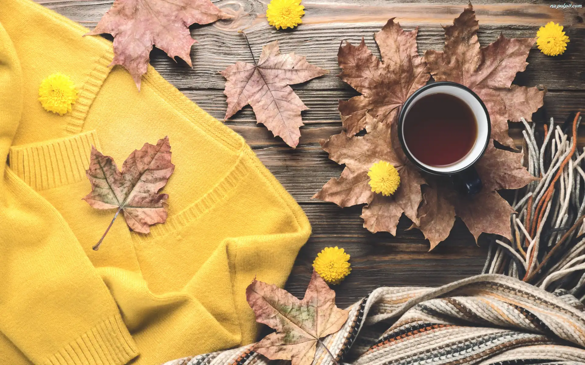 Kompozycja, Liście, Szalik, Kubek, Kawa, Żółty, Sweter, Kwiaty, Klonu, Jesienna, Żółte Na Pulpit |
