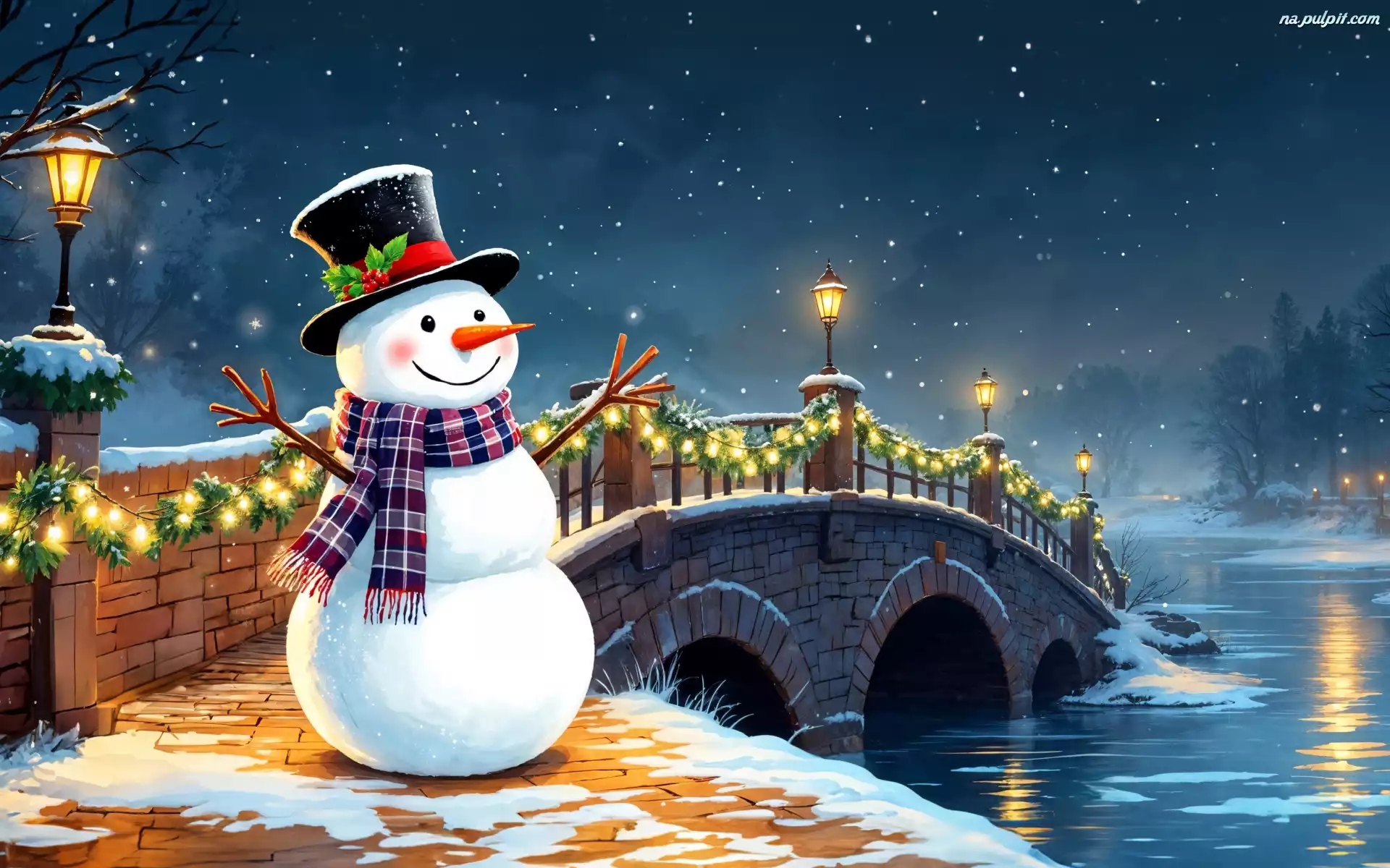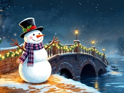 Most, Cylinder, Lampy, Zima, Rzeka, Śnieg, Bałwan, Szalik Na Pulpit