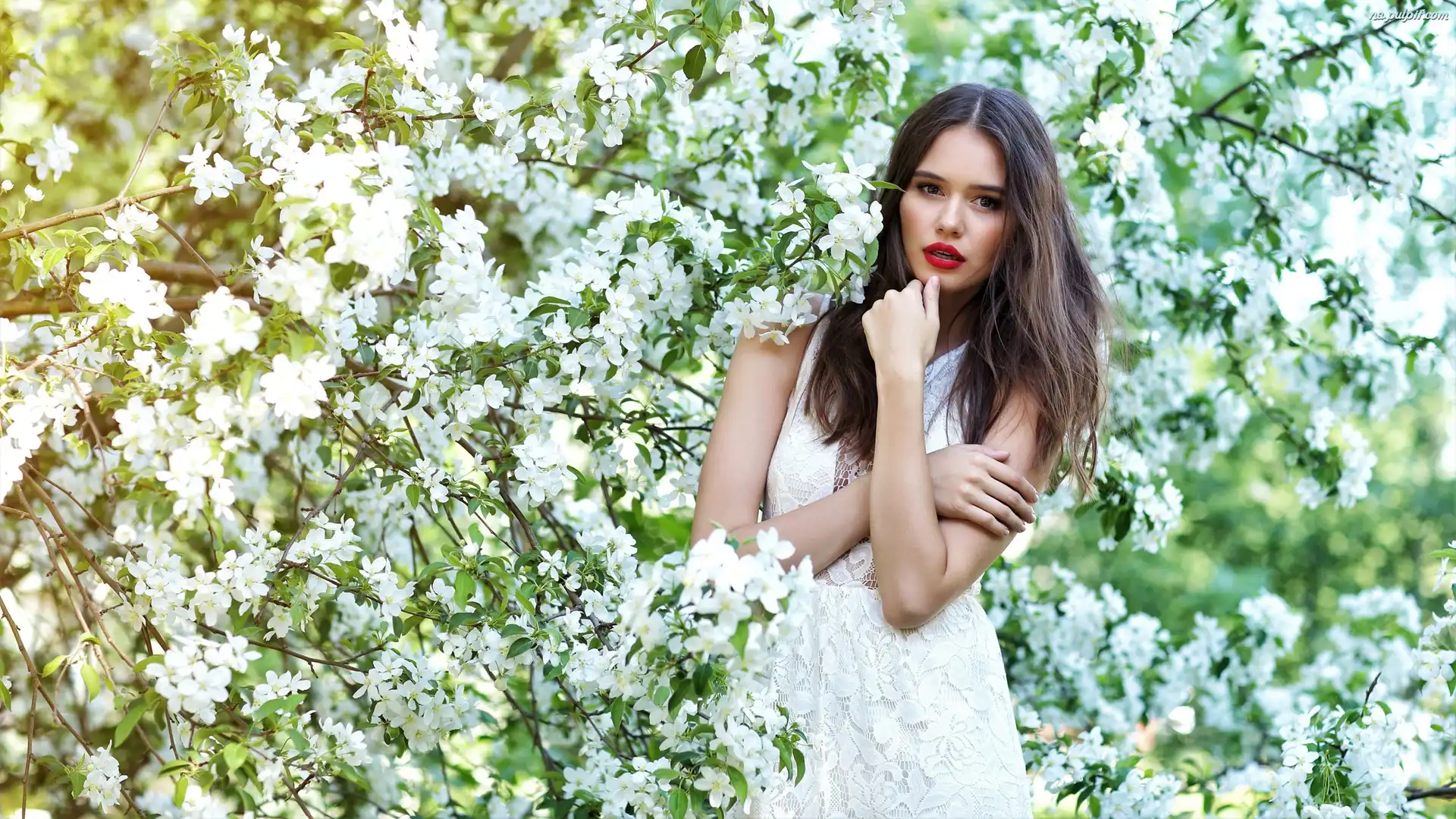 Gałązki, Szatynka, Okwiecone, Włosy, Długie, Kobieta, Drzewo Na Pulpit