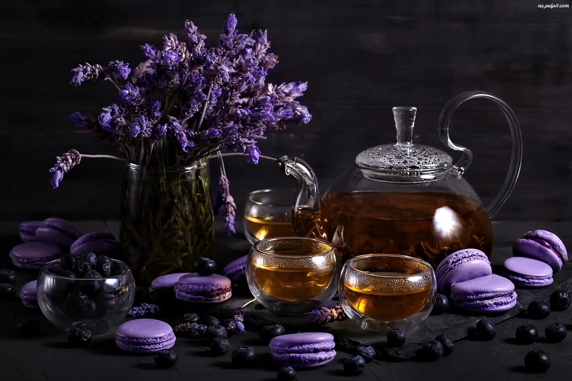 Jagody, Szklany, Makaroniki, Wazon, Czajnik, Herbata, Lawenda Na Pulpit
