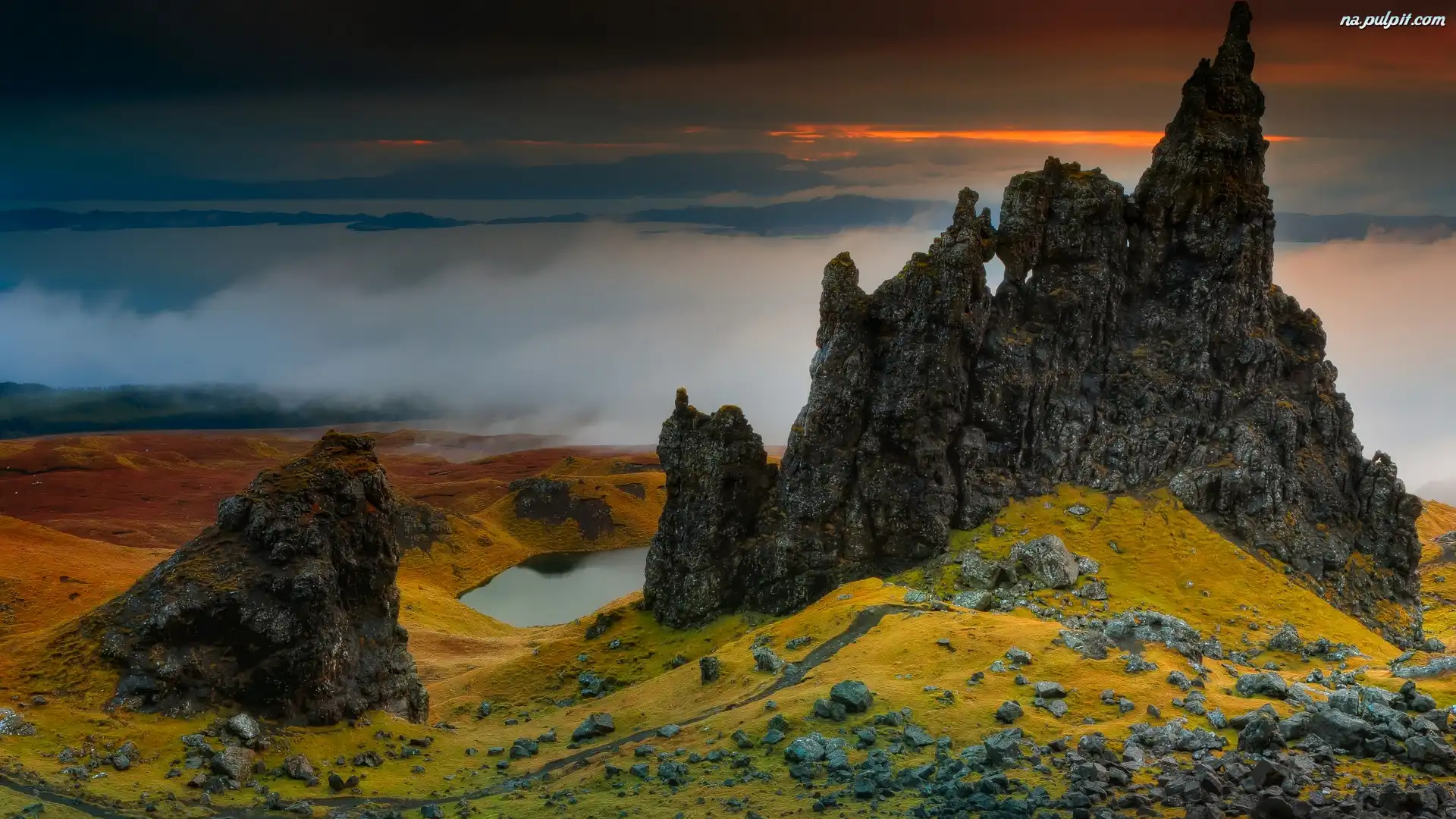 Mgła, Skały, Jezioro, Wyspa Skye, Szkocja, Zachód słońca, Wzgórze The Storr, Morze Na Pulpit