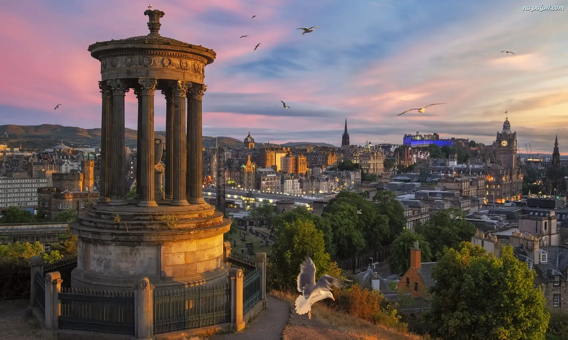 Szkocja, Domy, Zachód słońca, Pomnik, Dugald Stewart, Drzewa, Edynburg Na Pulpit