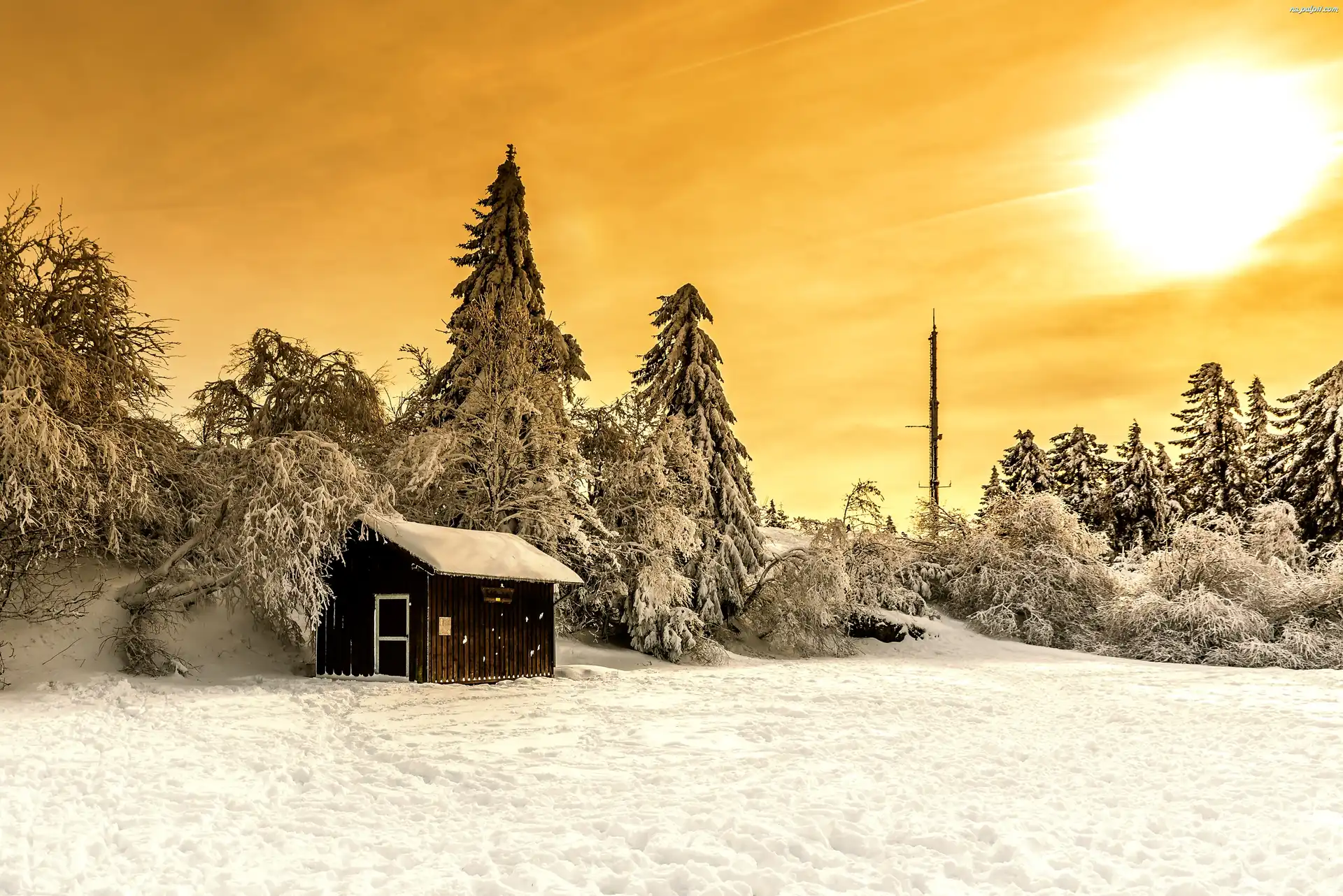 Szopa, Ośnieżone, Zima, Świerki