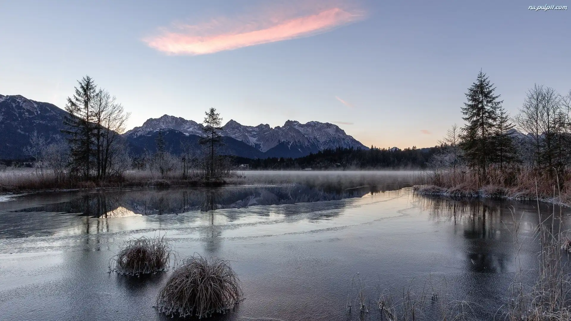 Szron, Drzewa, Góry, Jezioro, Trawy Na Pulpit